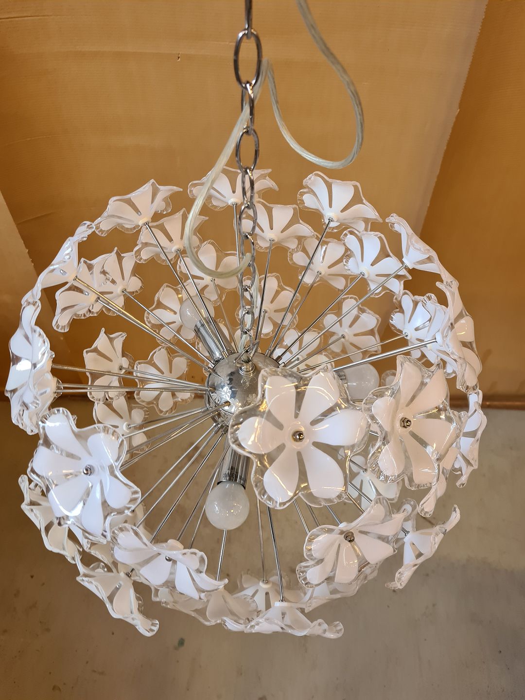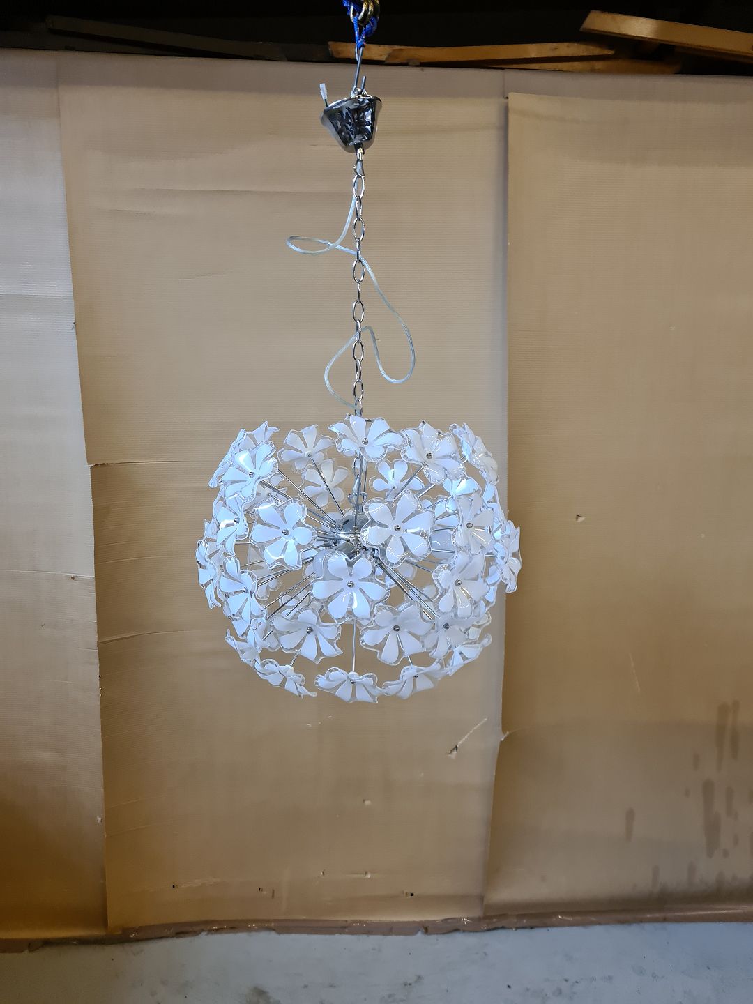 Loftlampe i metal med blomster af hård plast,den er fra 2000erne. Højde 90cm Diameter 55cm Emne nummer: 72328