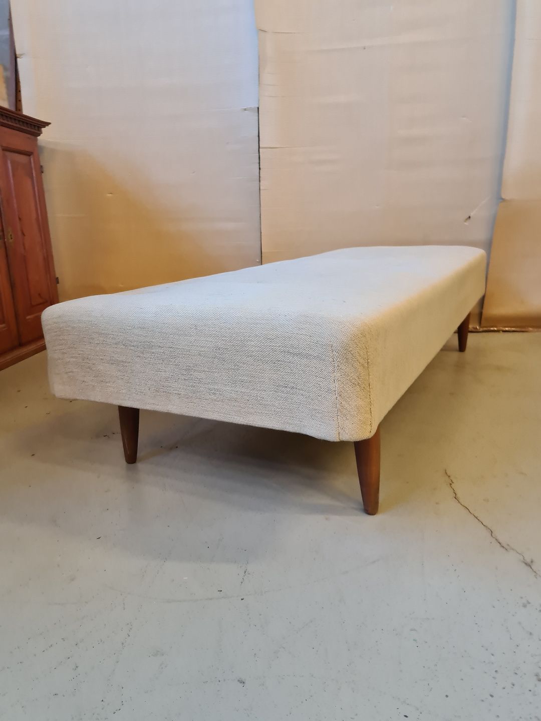 Briks med løs ryg og skuffe fra 1950erne. Den har brugsspor og mangler et par knapper. Sødehøjde 41cm ryghøjde 82cm Bredde 69cm Længde 190cm Emne nummer: 72353