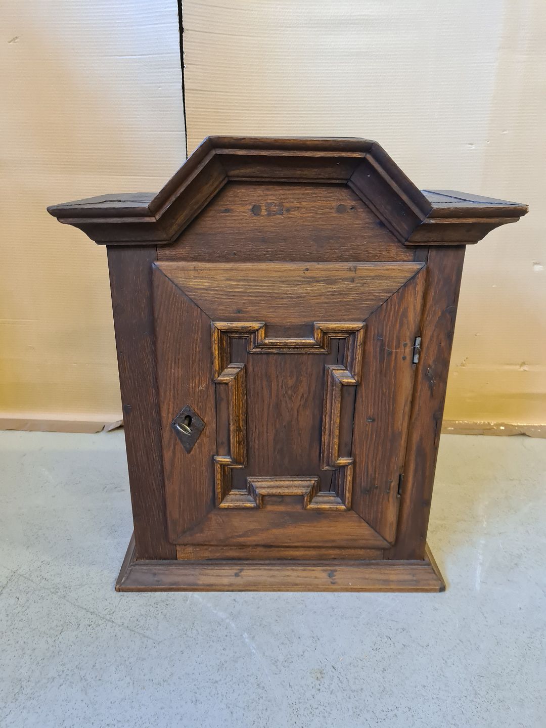 Vægskab i massivt egetræ, fra 1900erne. Det har brugsspor og en lille defekt. (se foto) H 62cm B 53cm D 27cm Emne nummer: 72470