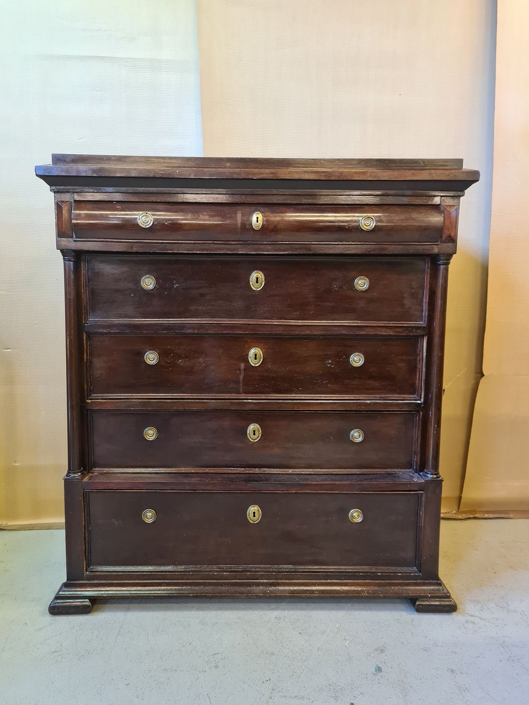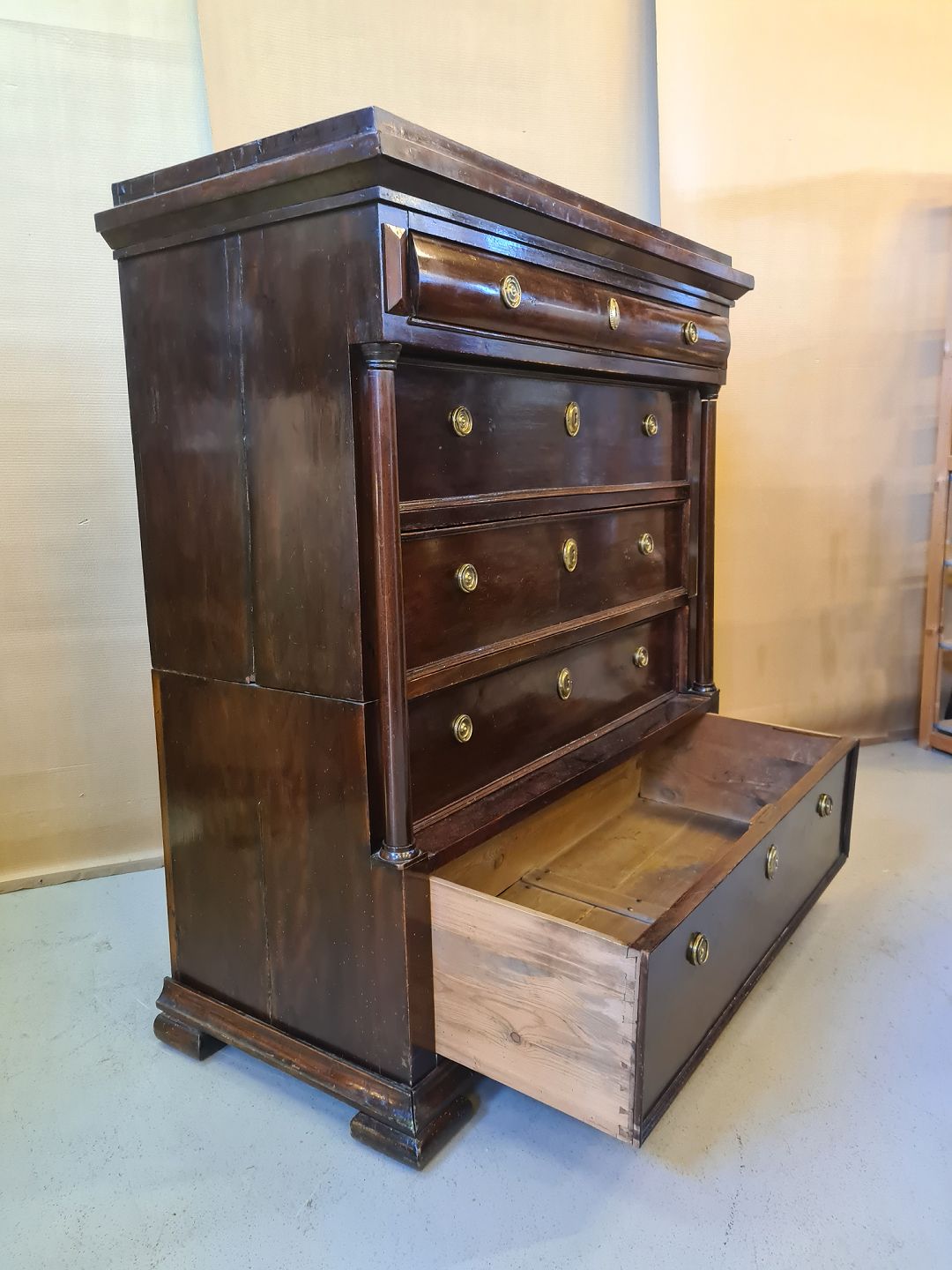Dragkiste i fineret mahogni og bøgetræ, fra 1890erne. Den har brugsspor. H 136cm B 123cm D 55cm Emne nummer: 72518