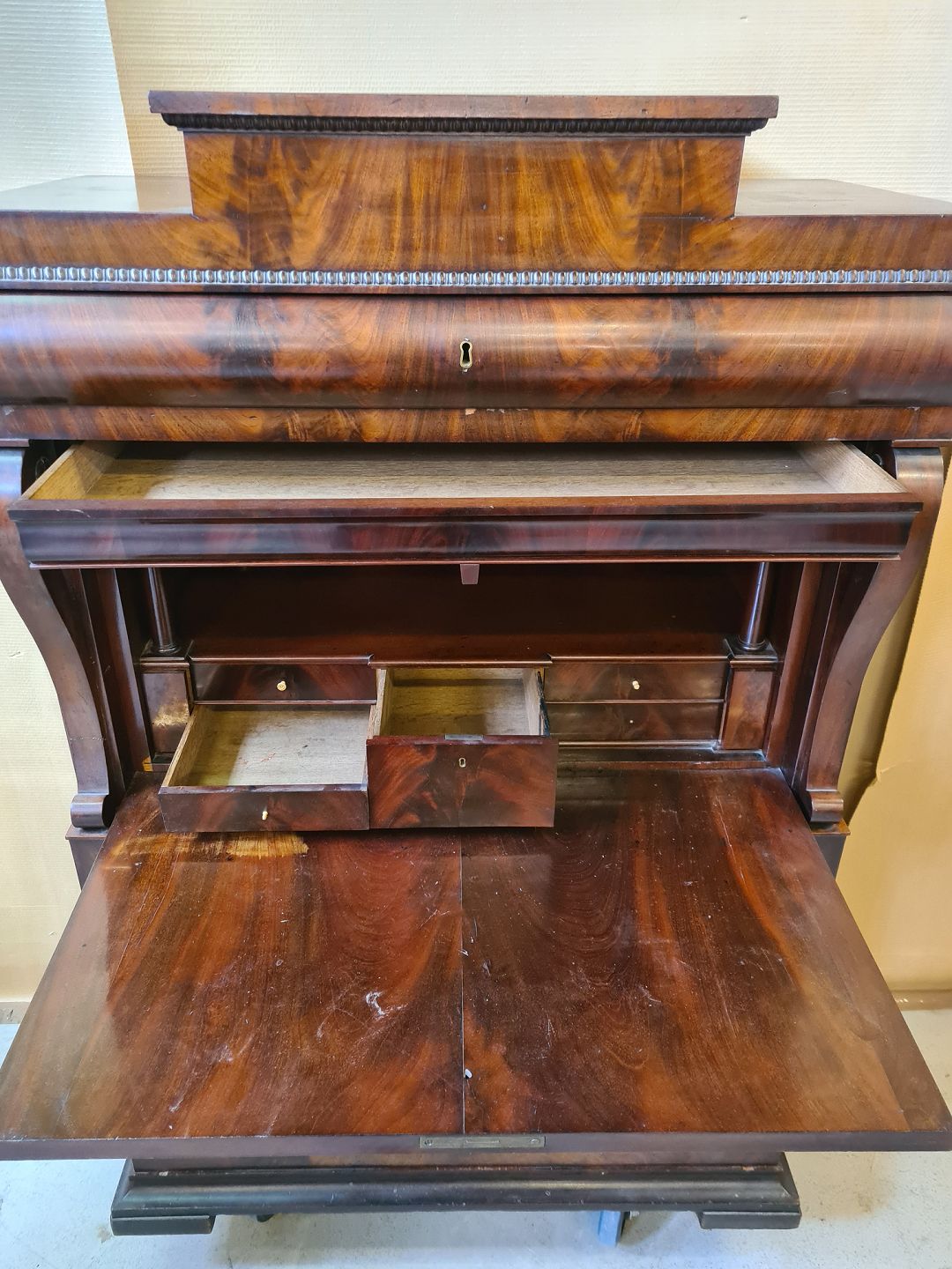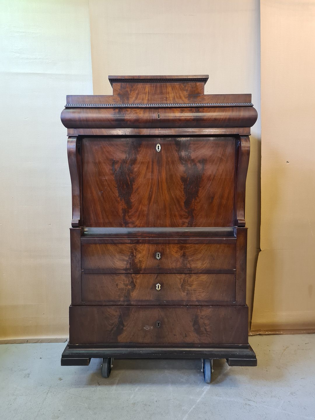Sekretær i fineret mahogni, fra 1890erne. Den har brugsspor. H 152cm B 101cm D 50cm Emne nummer: 72539