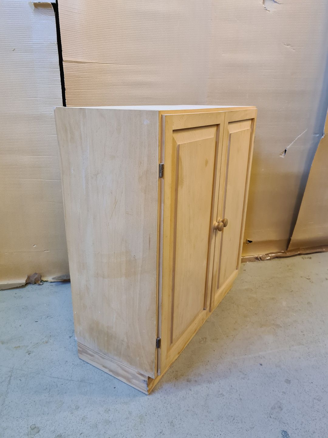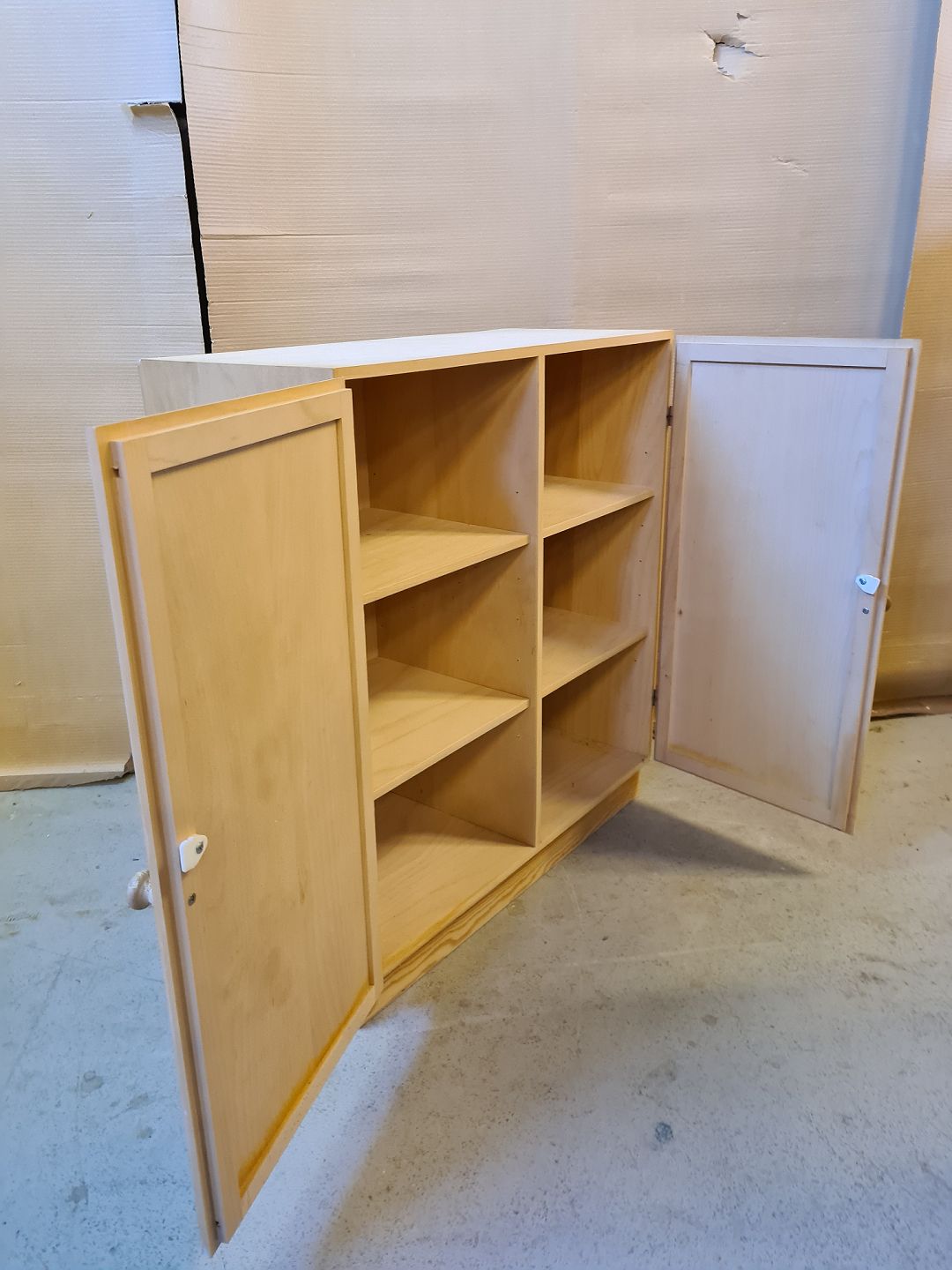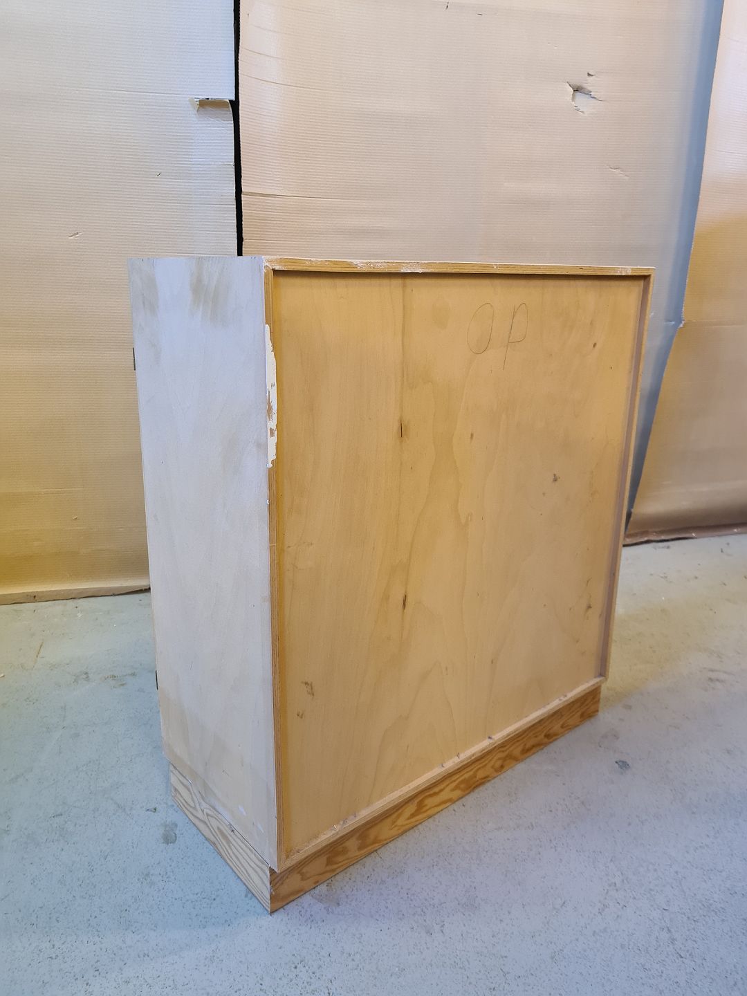 Bogskab i krydsfiner, fra 2000erne. Der medfølger en sokkel. Det har brugsspor. H 70cm B 70cm D 30cm Sokkel højde 7cm Emne nummer: 72620