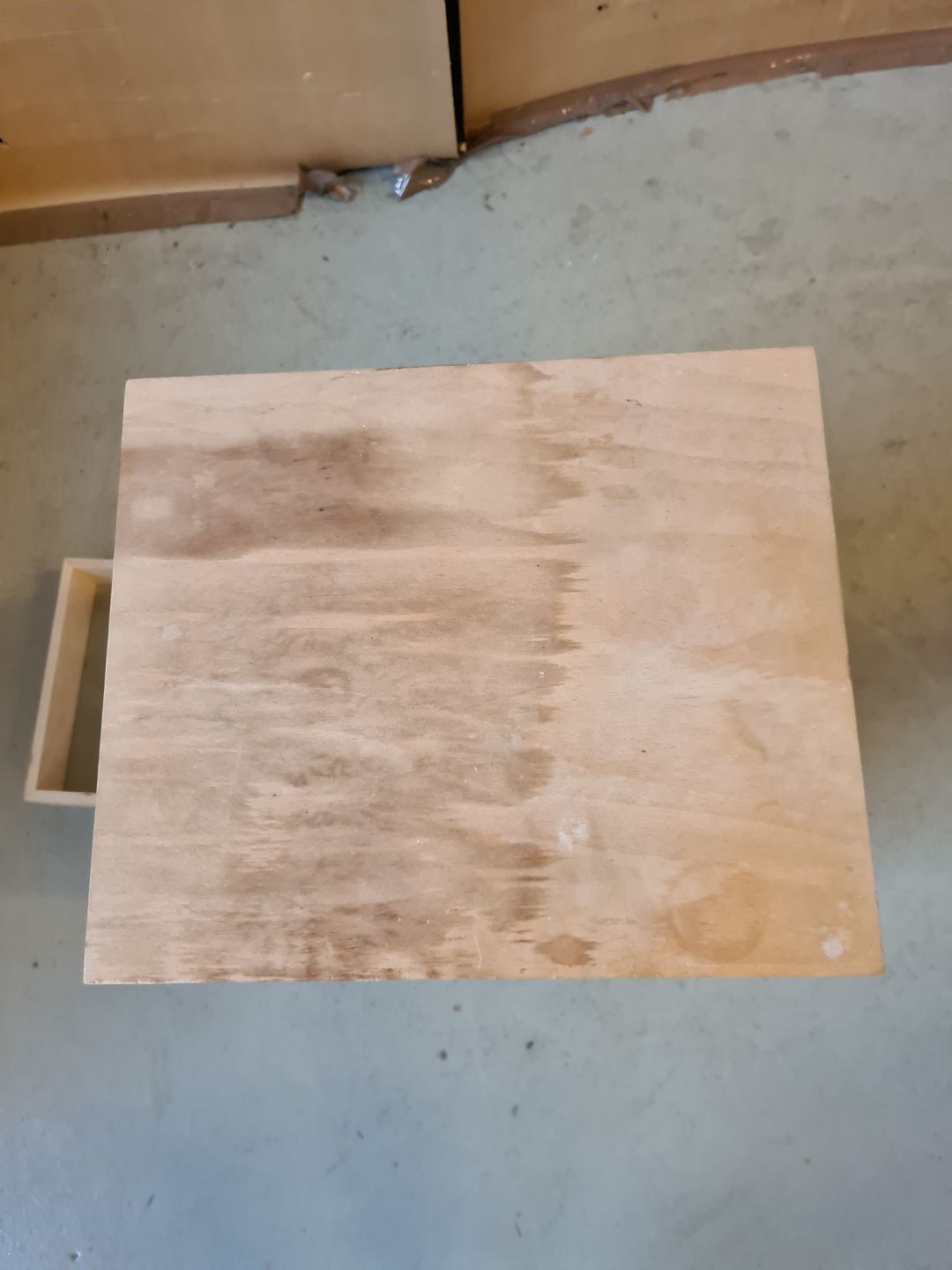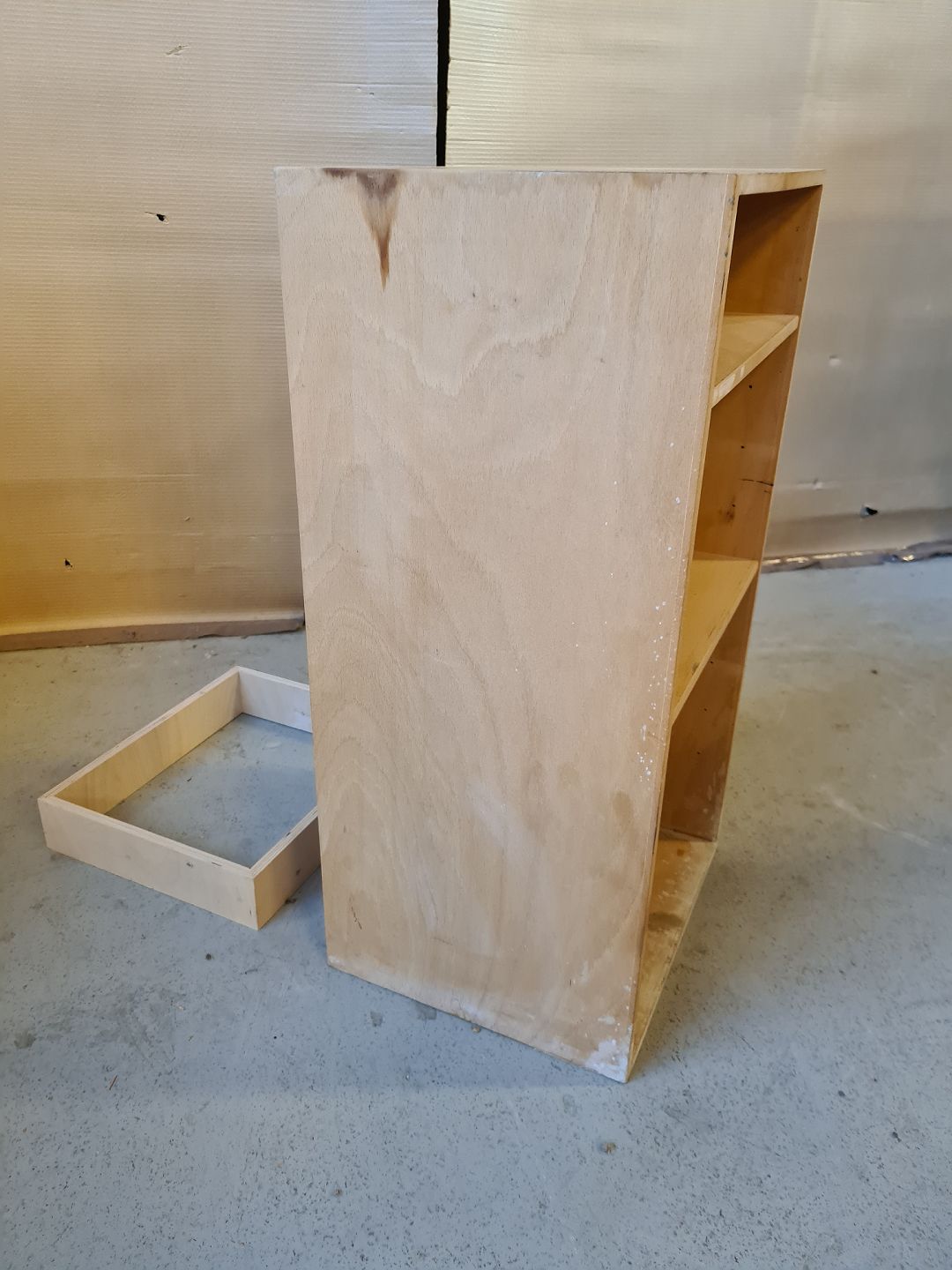 Reol i krydsfiner med sokkel, fra 2000erne. Den har brugsspor. H 70cm B 35,5cm D 30cm Sokkel højde 30cm Emne nummer: 72641