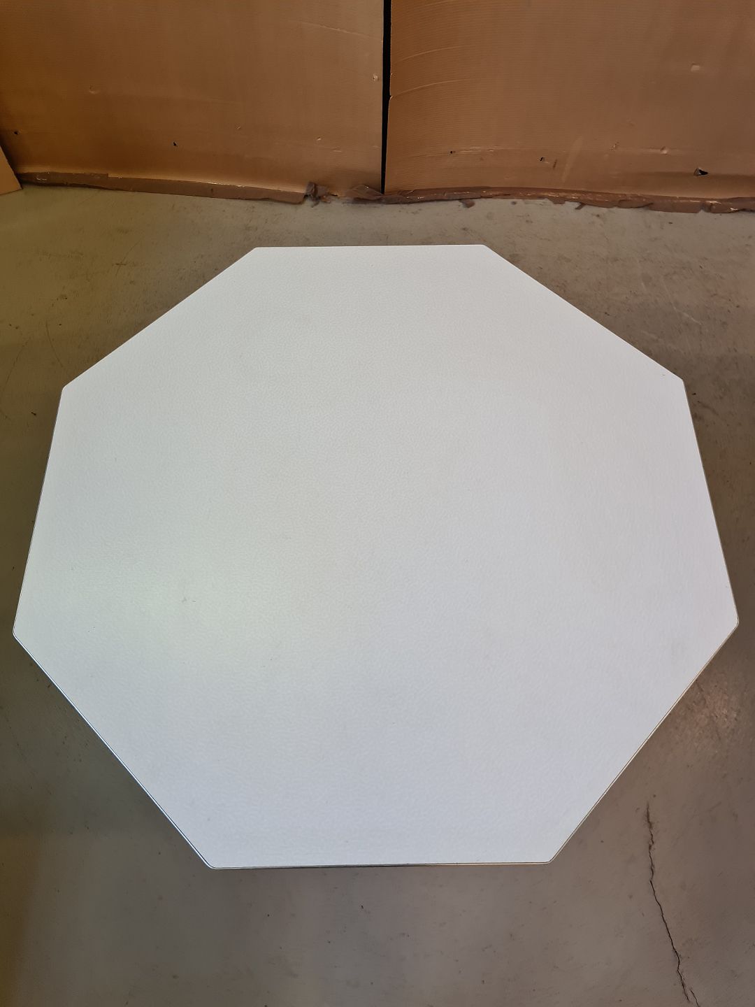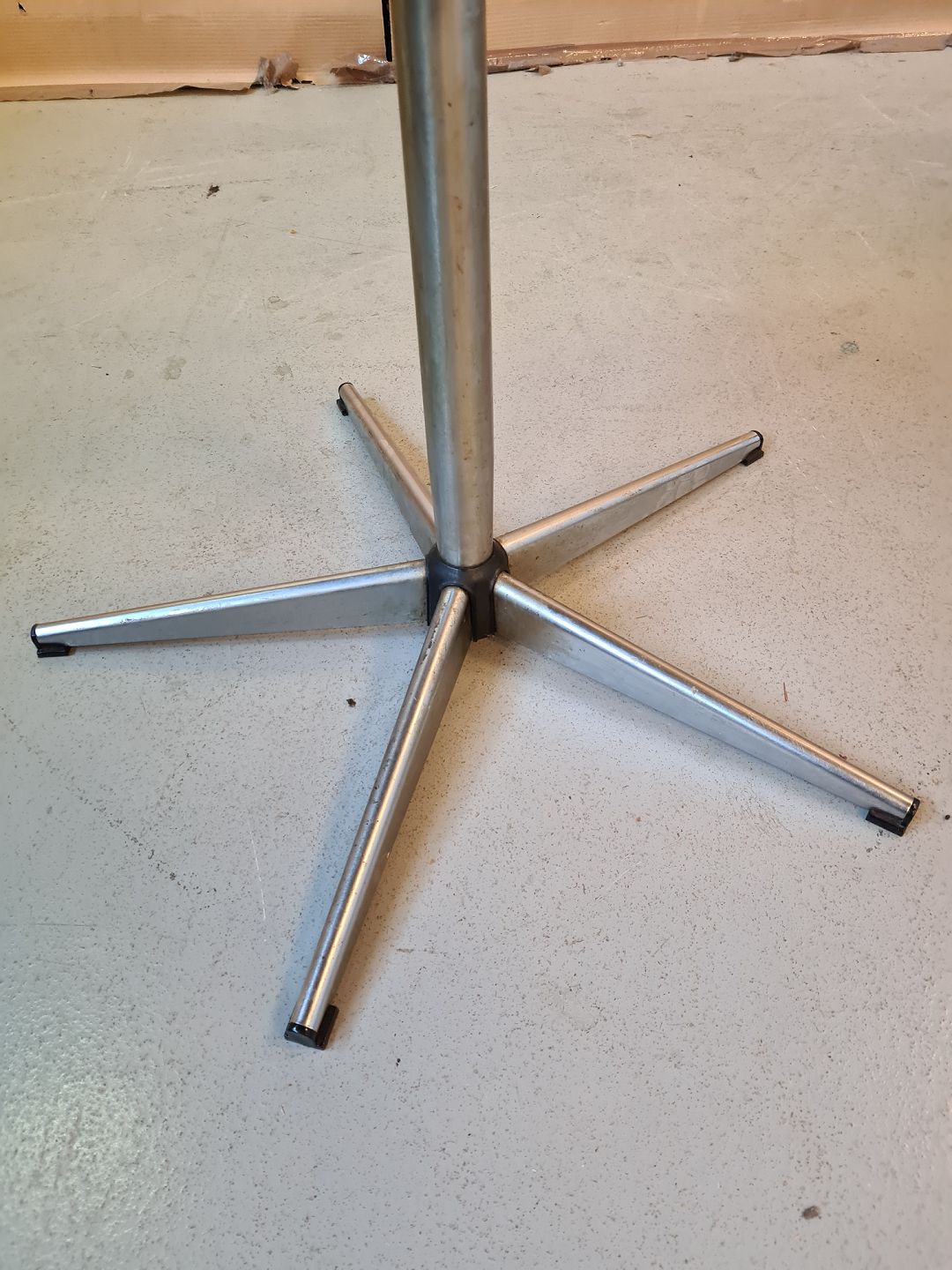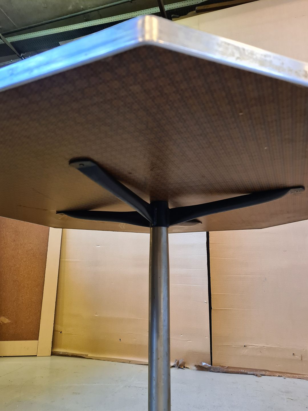 Bord i metal med bordplade af laminat, fra 1980erne. Det har brugsspor. Højde 71cm Diameter 97cm Emne nummer: 72693