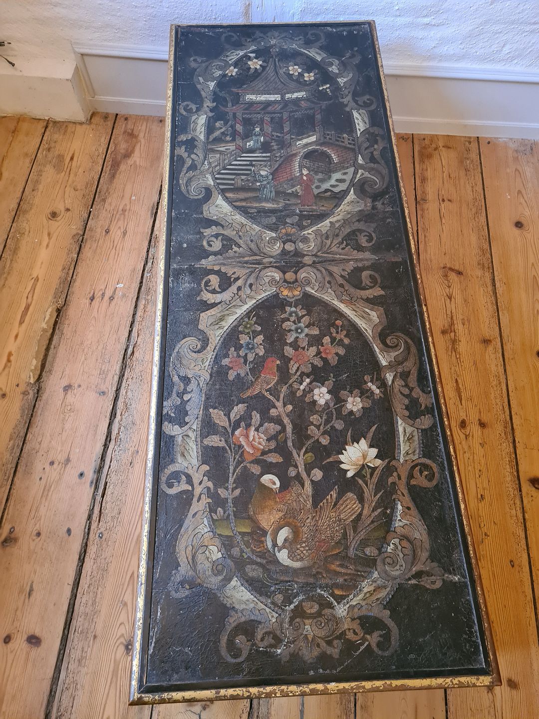 Orientalsk sofabord med glasplade, bestående af håndmalet panel fra 1700 tallet på nyere bordstel fra 1920´erne. Fremstår virkelig flot og velholdt. HxLxB 41x157x56 cm. Emne nummer: 80220