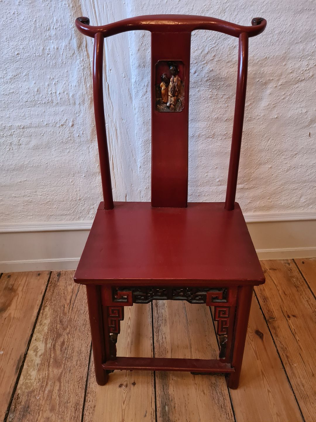 Orientalsk stol fra starten af 1900 tallet. Fremstår udmærket stabil dog med en revne i sædet omkring ryglænet i venstre side. HxBxD: 92x44x41 cm. Siddehøjde 44 cm. Emne nummer: 80223