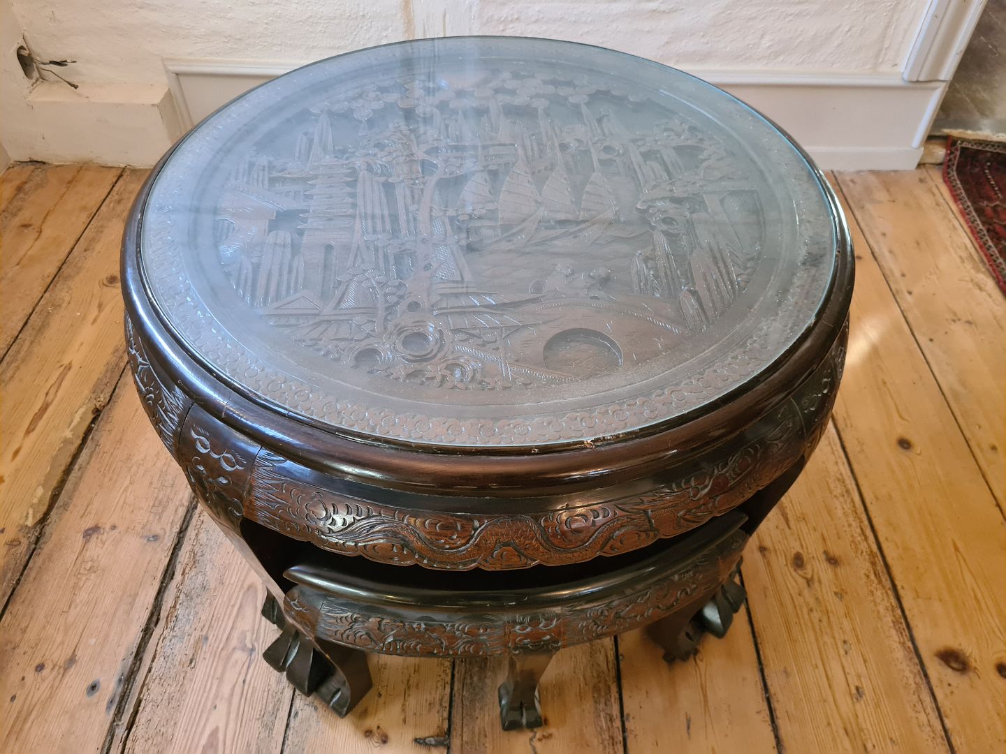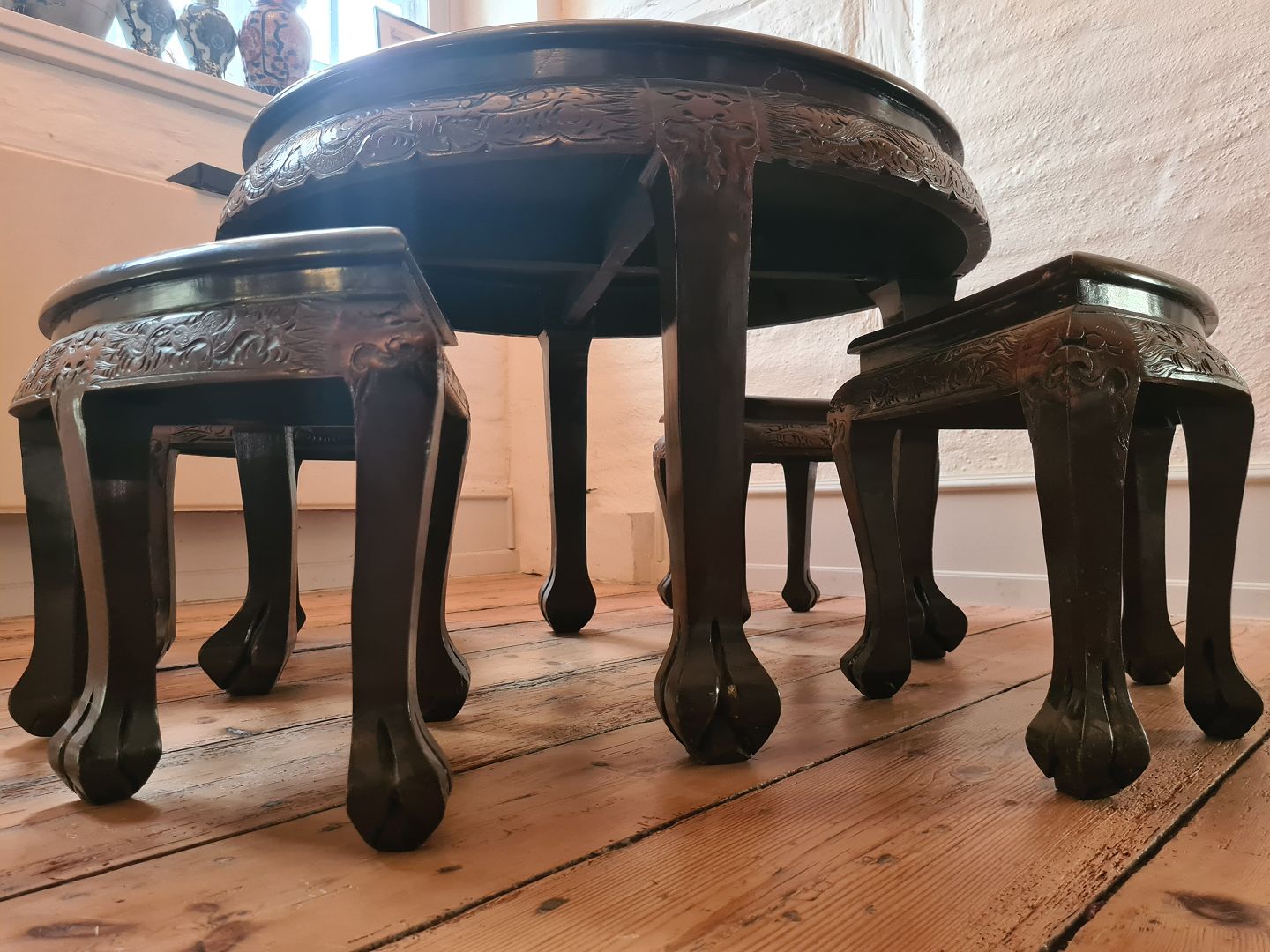 Orientalsk sofabord med 4 tilhørende skamler fra 1920´erne. Bordpladen har et rigt udskåret motiv og overliggende glasplade. Fremstår alt i alt pænt og velholdt uden nævneværdige brugsspor.