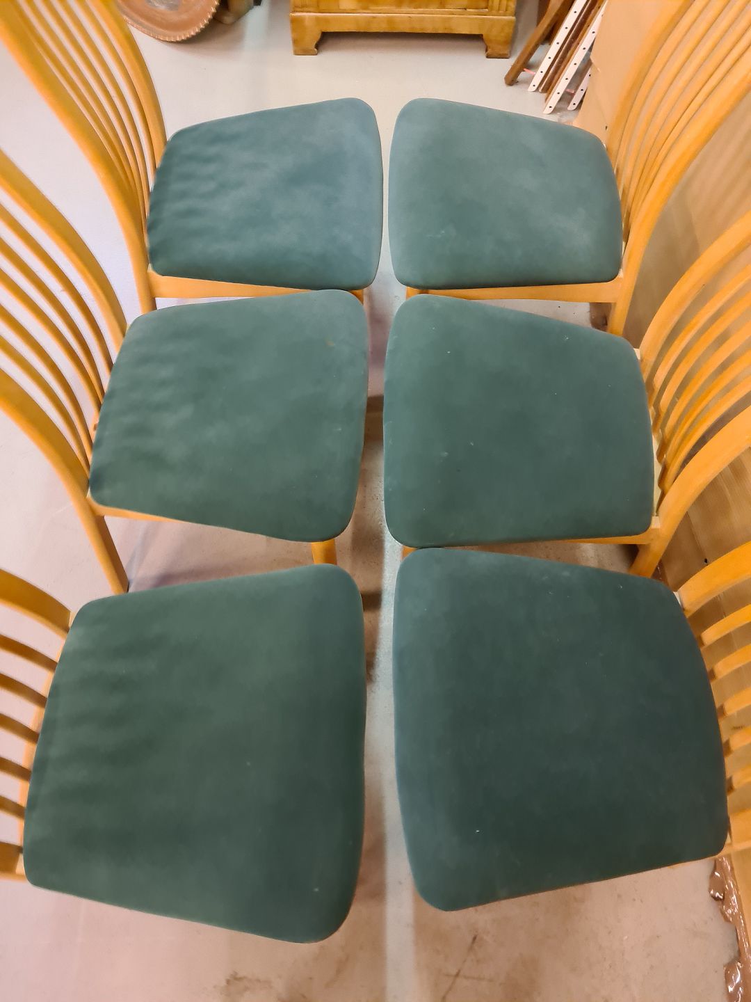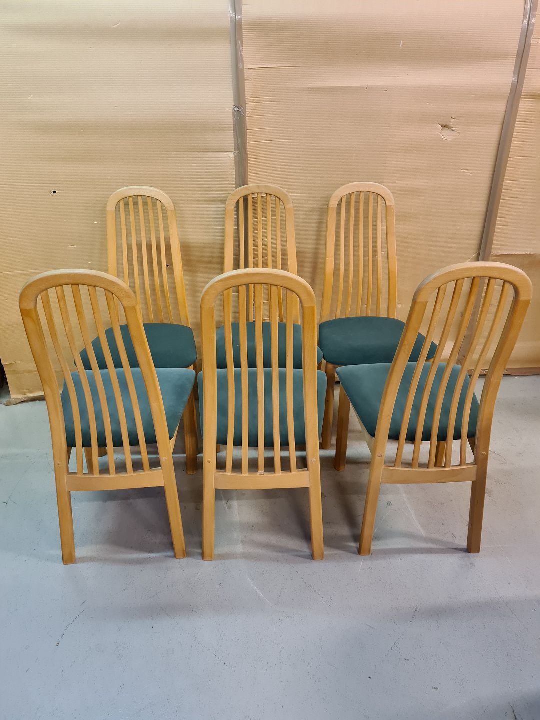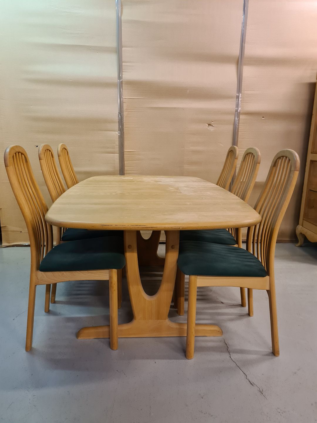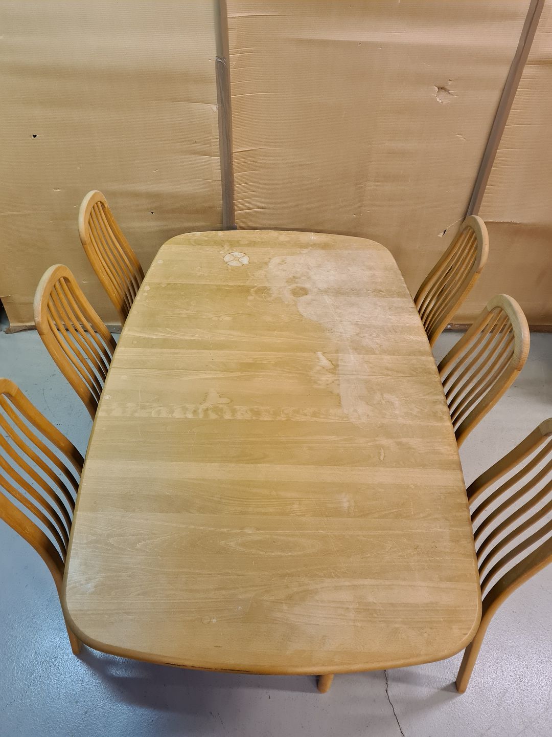 Spisebord med 1 tillægsplade og 6 stole i massivt bøgetræ, fra 2000erne. Bordpladen trænger til en slibning. Bord mål : h 72cm B 105cm L 172cm Længde med tillægspladen 222cm Emne nummer: 72967