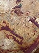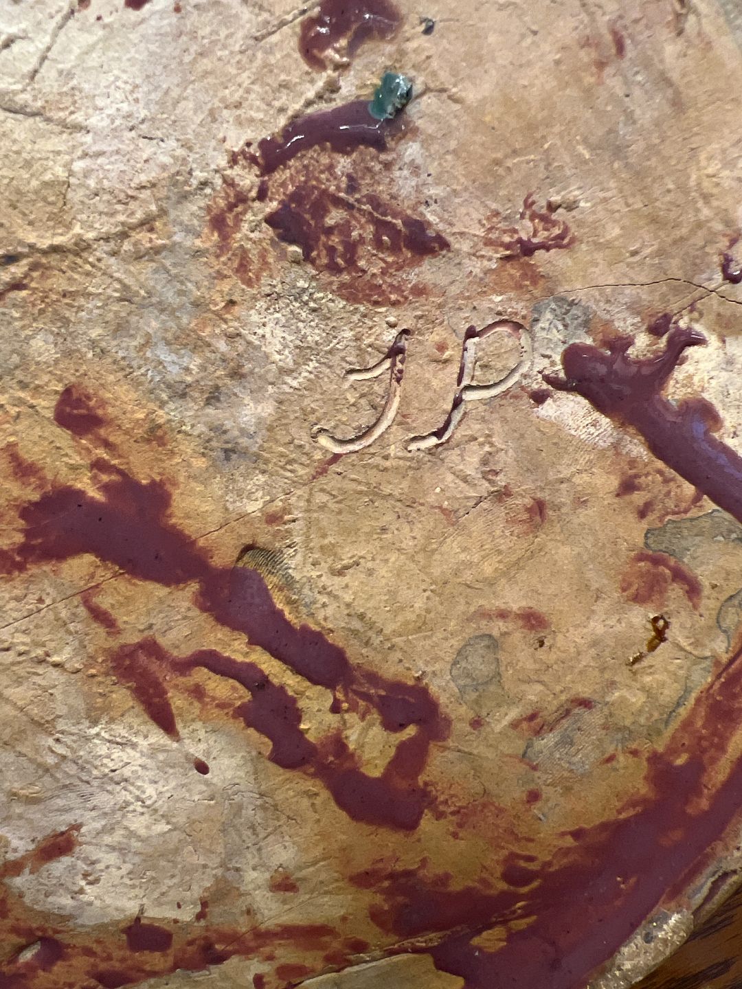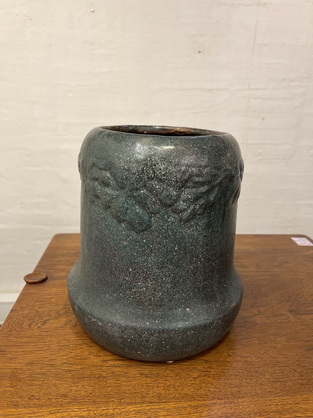 Jens Pedersen vase i glaseret lertøj med skønvirke dekoration. Udført hos Søren Kongstrand ca. 1910'erne. Vasen er fin, dog med små chips på skærven samt en hårrevne i bunden, se foto. Mål: H. 29 cm. Ø. 25 cm. Emne nummer: 50620