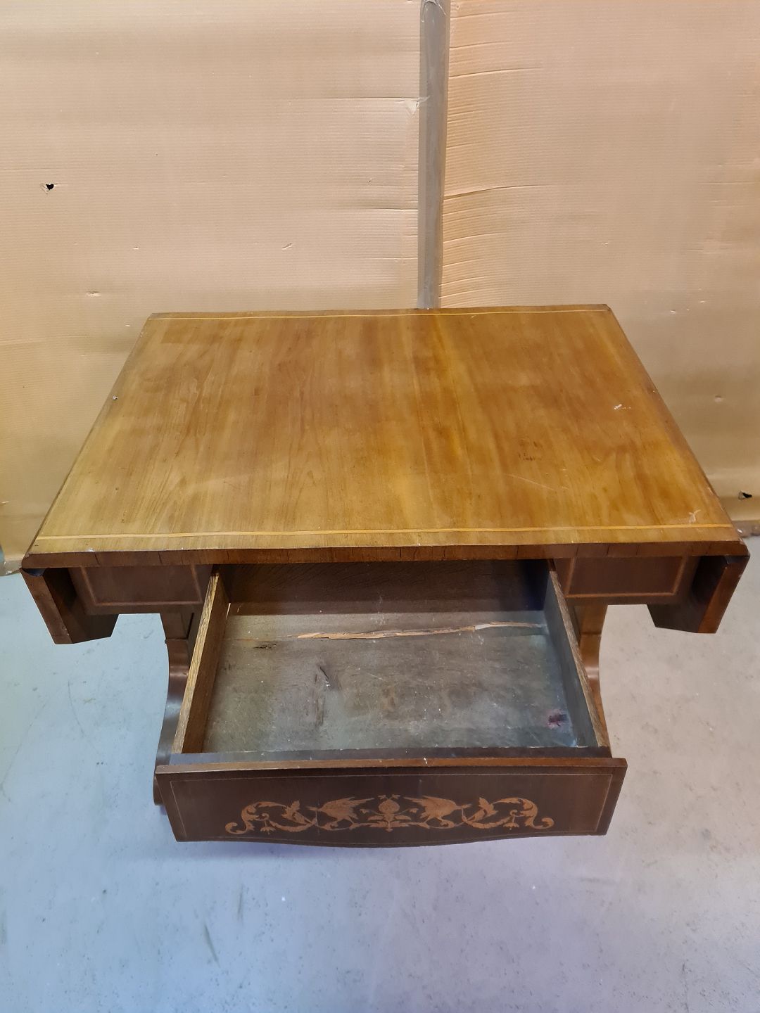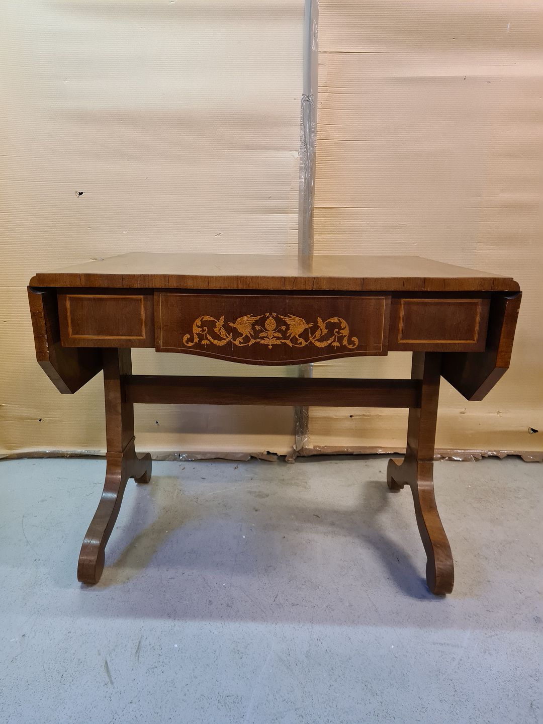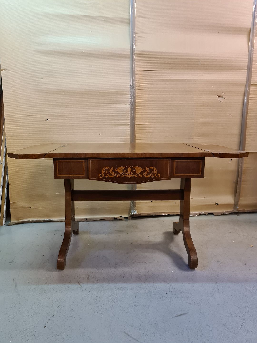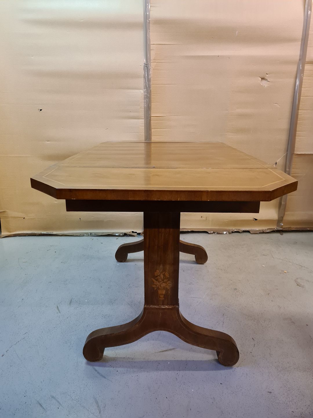 Salonbord i fineret mahogni, fra 1900erne. Det har brugsspor. H 78cm B 73cm L 98cm Længde med klapper 146cm Emne nummer: 73067