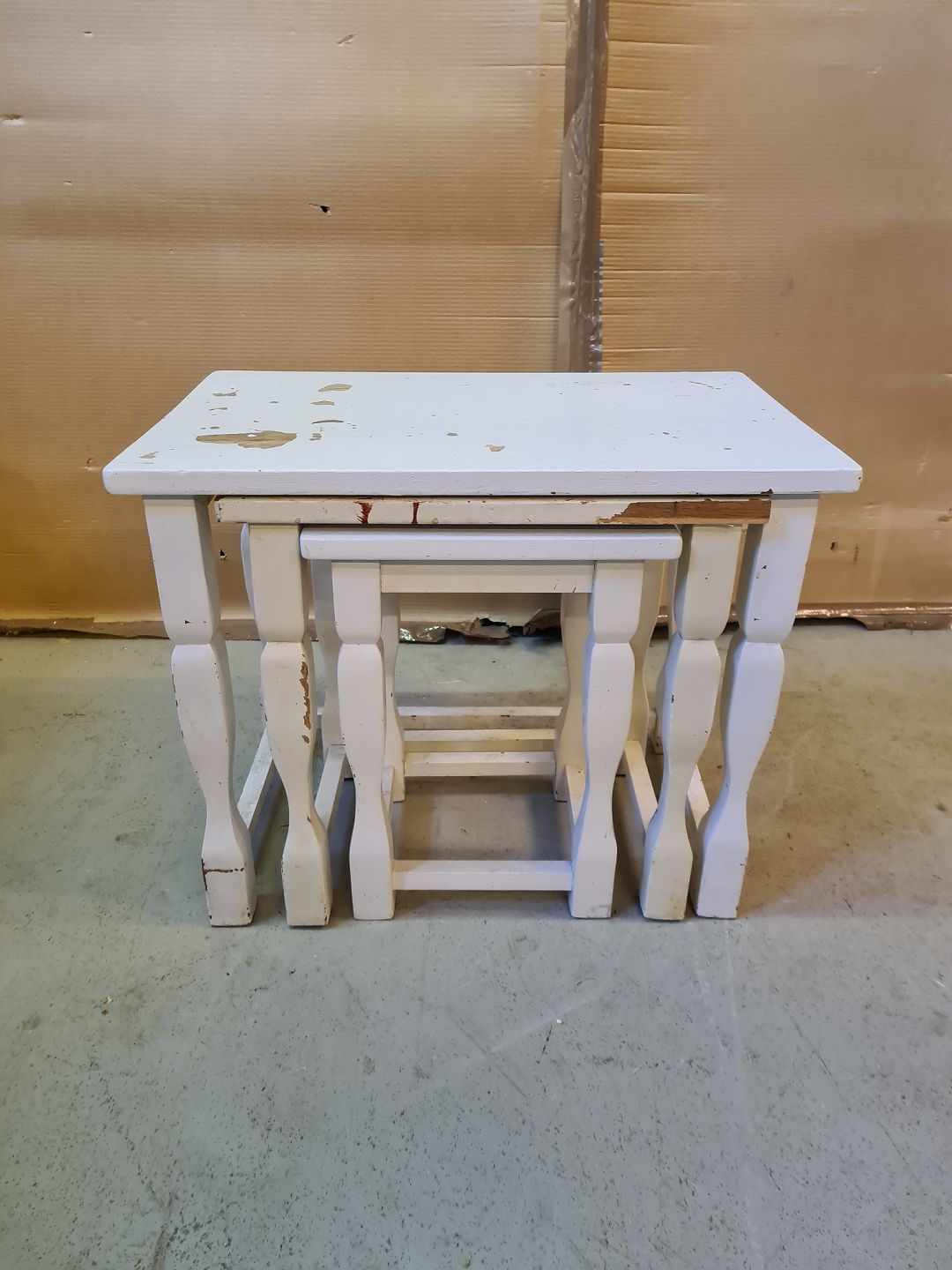 3 stk. indskudsborde i malet massivt egetræ, fra 1980erne. Det har brugsspor. H 40cm B 60cm D 38cm Emne nummer: 73079