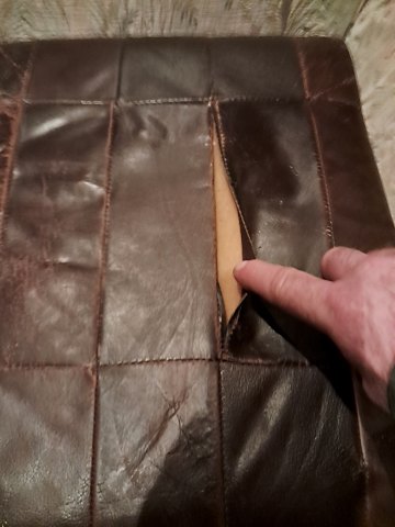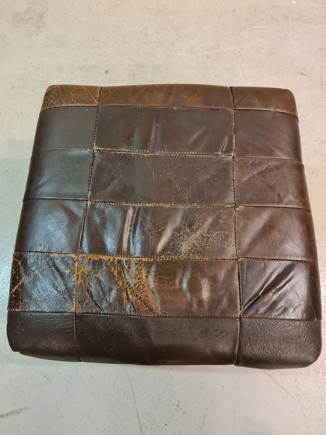 Fodskammel i metal og læder, fra 1980erne. Den har brugsspor og slid, og er gået op i en syning.( se foto ) H 34cm B 46cm D 46cm Emne nummer: 73202