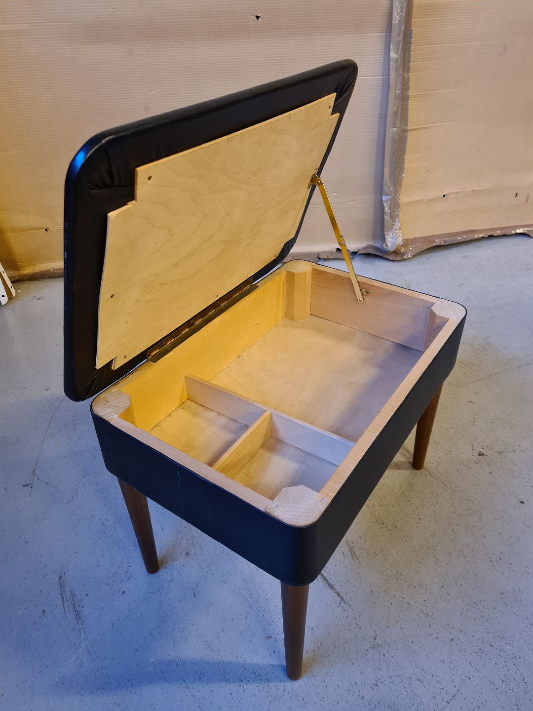 Puf i kunstlæder med ben af bøgetræ, fra 1960erne. Den har brugssor. H 36cm B 34cm L 50cm Emne nummer: 73268
