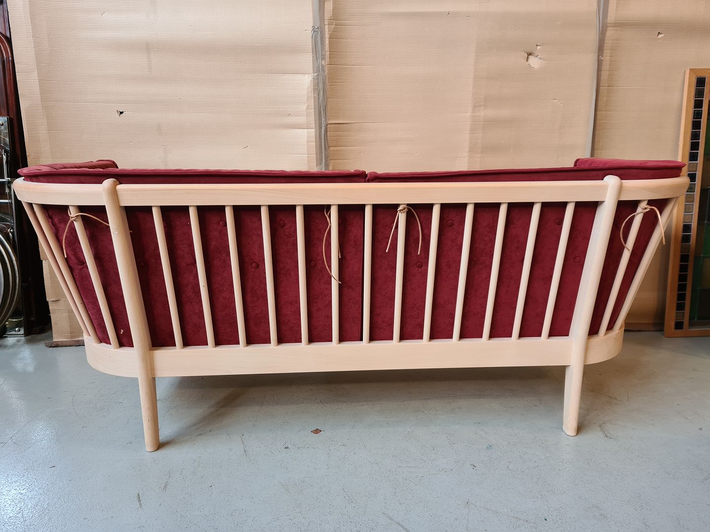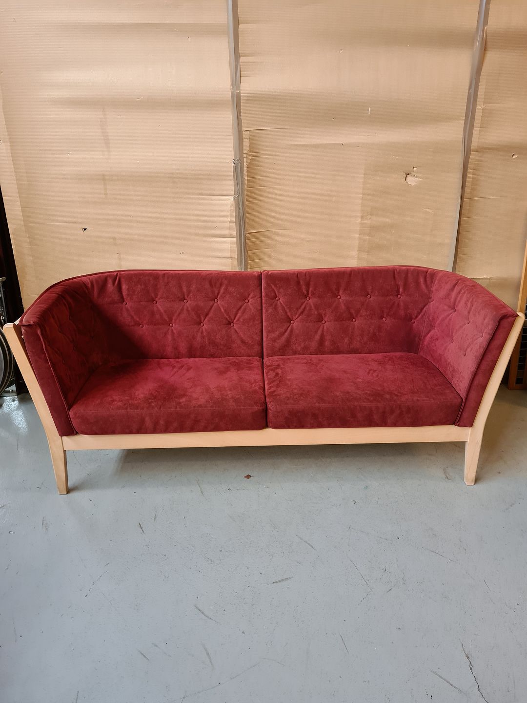 3 Personers sofa i massivt bøgetræ med betræk af kunst ruskind, fra 2000erne. Betrækket har lidt brugsspor på armlæns hynden. H 80cm B 153cm D 70cm Sædehøjde 42cm Emne nummer: 73294