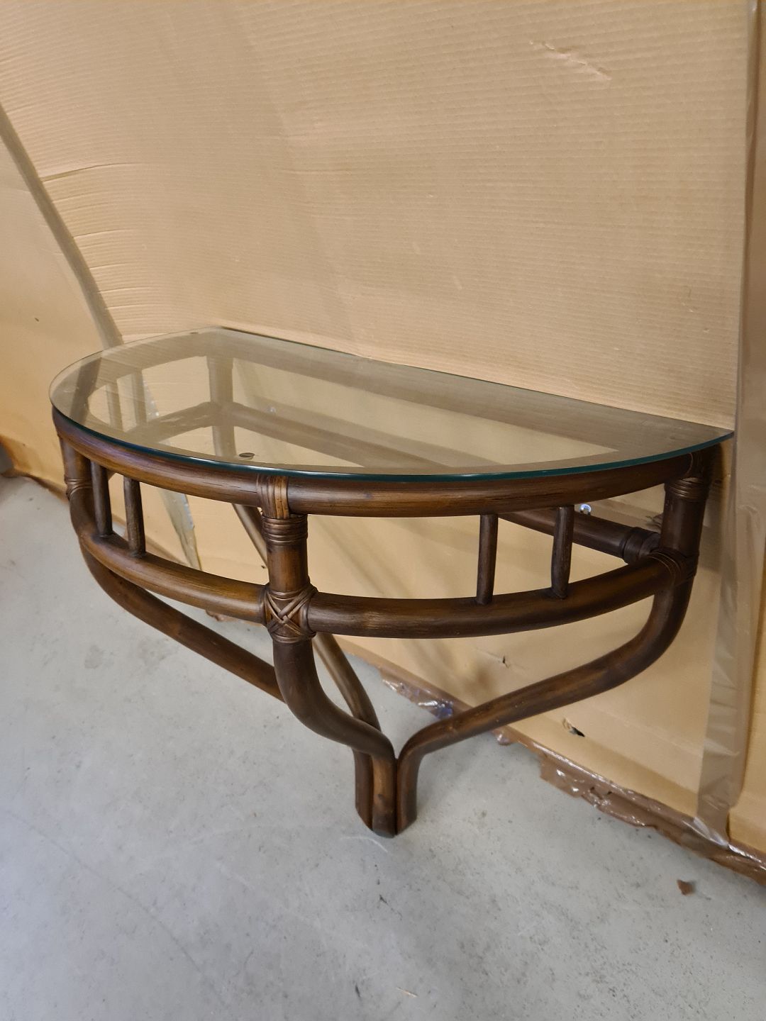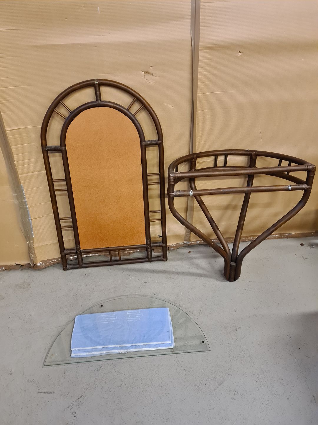 Spejl i bambus og konsol med gklasplade, fra 1990erne. Spejl mål : H 120cm B 73cm Konsol mål : h 75cm B 82cm D 41cm Emne nummer: 73351