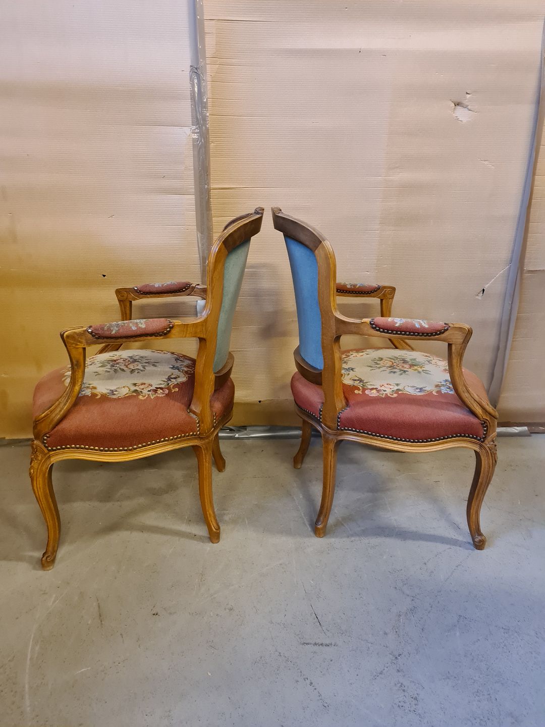 2 Stole i massivt bøgetræ med broderet betræk, fra 1950erne. De har brugsspor. Højde 88cm Sædehøjde 42cm Emne nummer: 73534