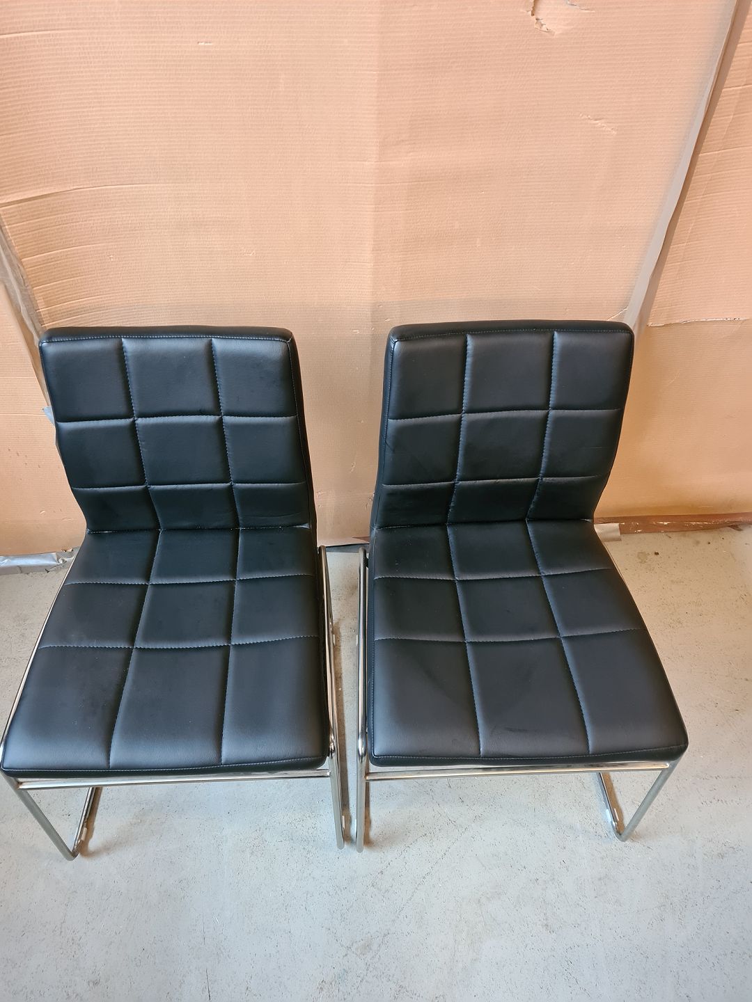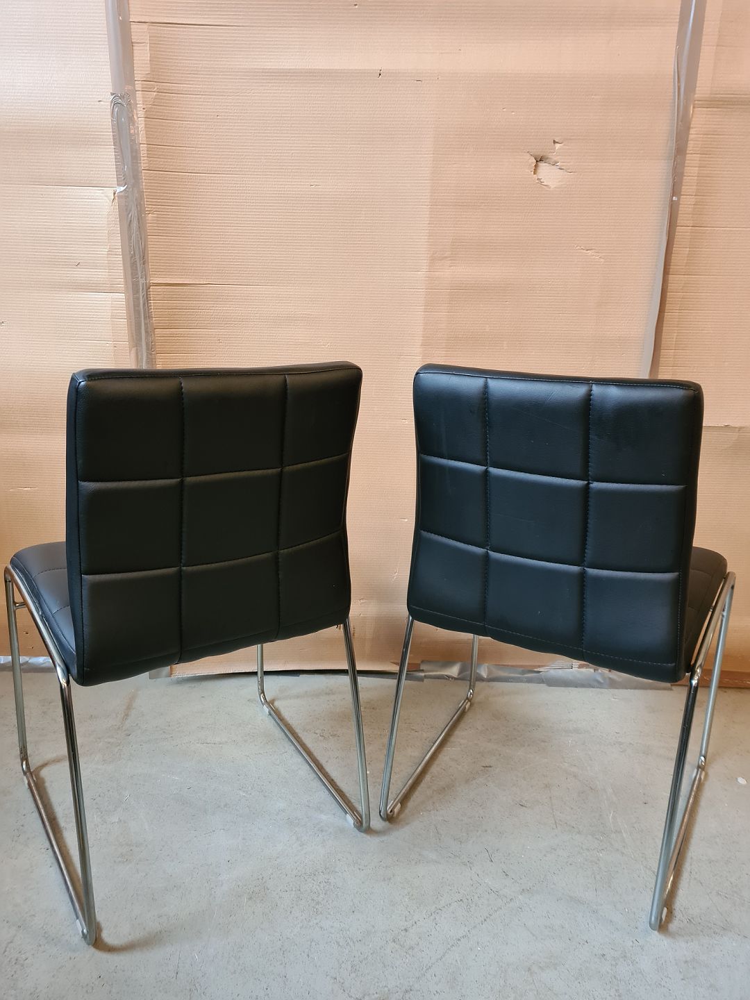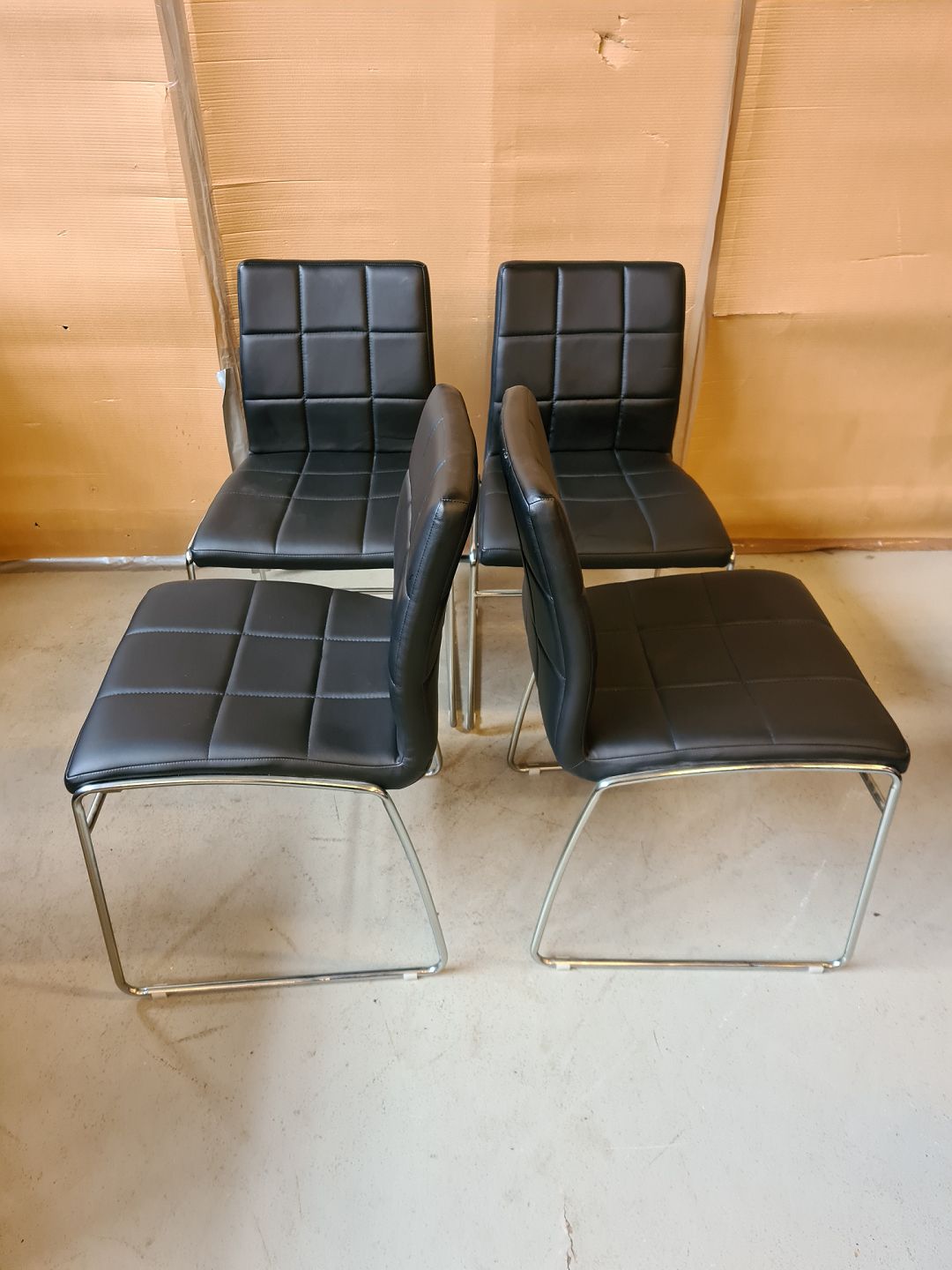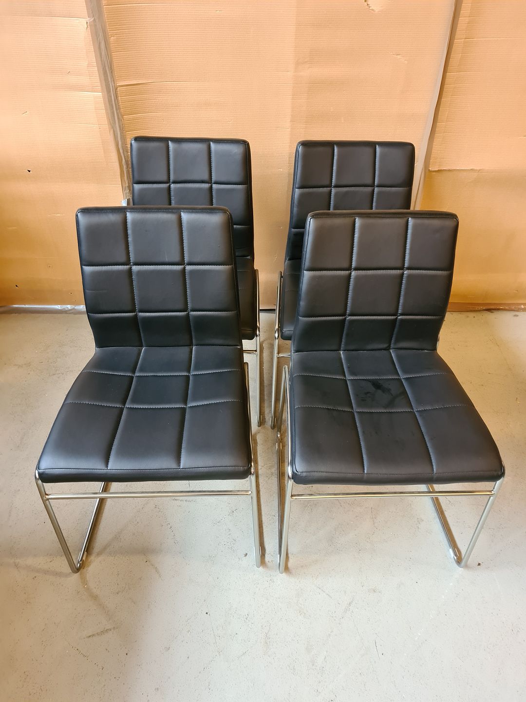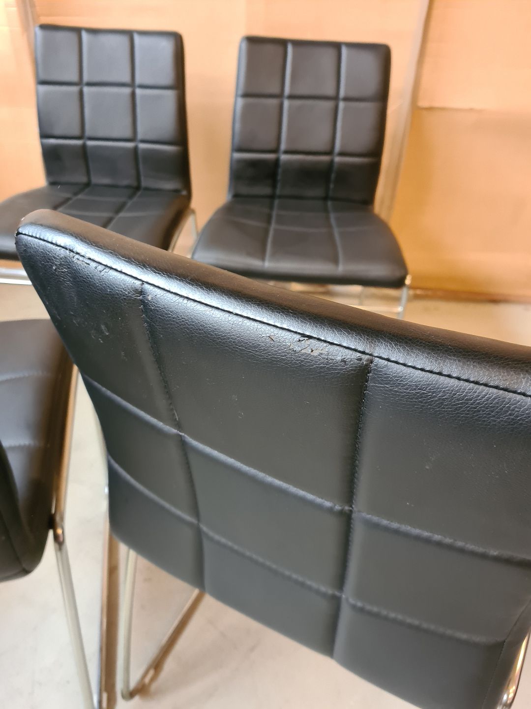 4 Stole i metal med kunstlæder, af nyere dato. De har små brugsspor. Højde 84cm Sædehøjde 47cm Emne nummer: 73611