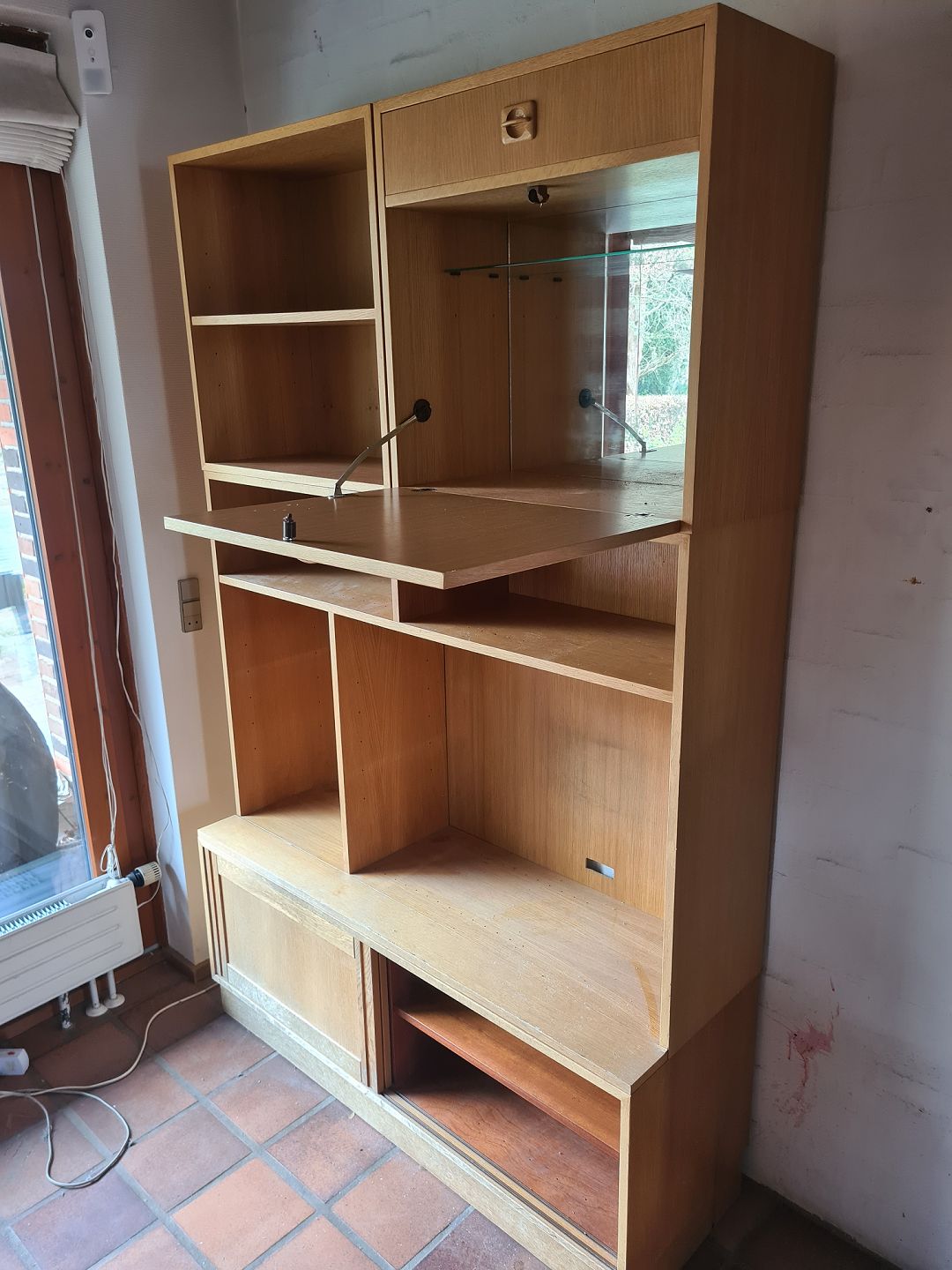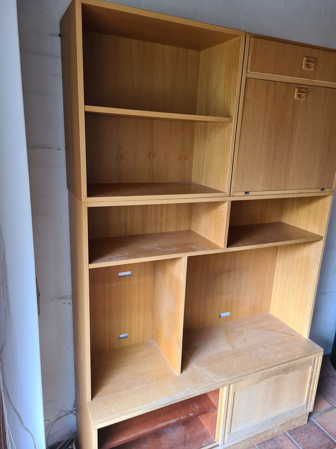 4 delt reolsektion i fineret egetræ, fra 1970erne. Den har brugsspor. Højde 192cm Bredde 120cm Dybde 40cm Emne nummer: 73795