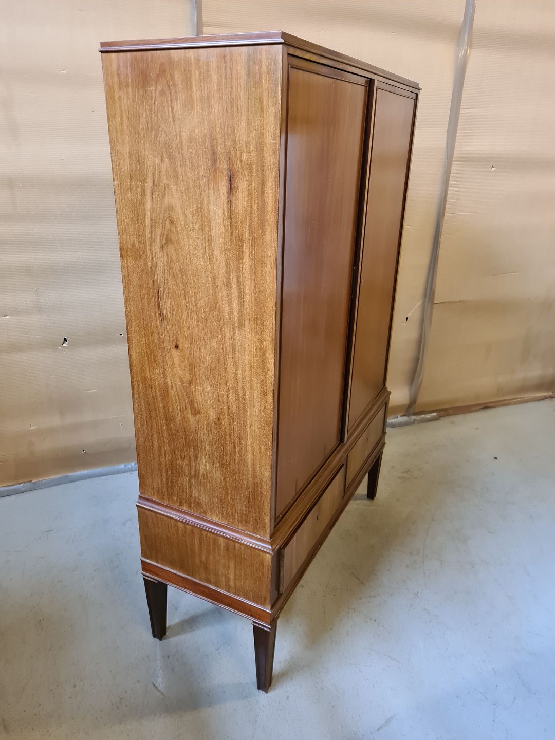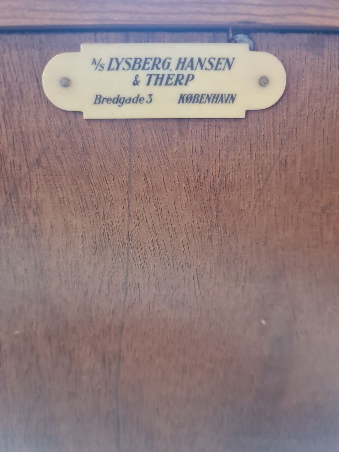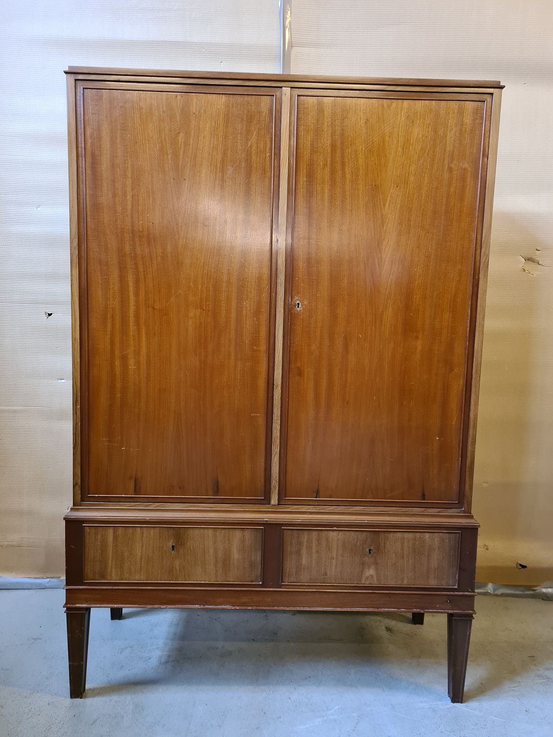 Lysberg Hansen og Terp dækketøjsskab i fineret mahogni, fra 1950erne. Det har brugsspor og defekte lister på soklen. Højde 154cm Bredde 103cm Dybde 40cm Emne nummer: 73809