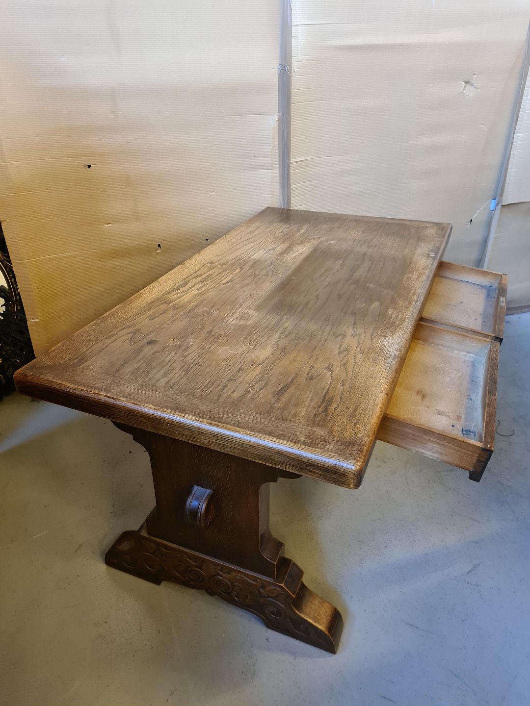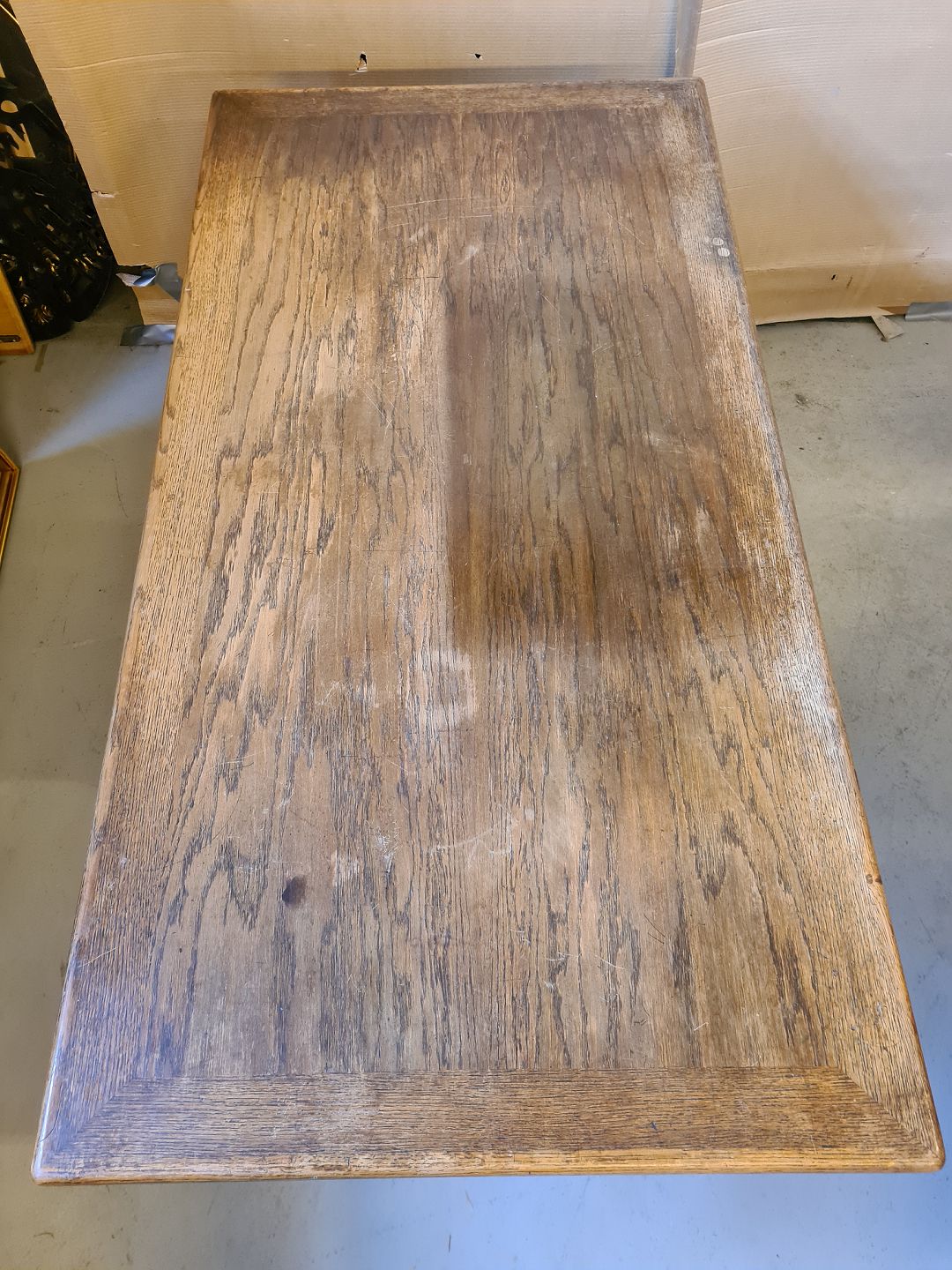 Bord i fineret egetræ, fra 1930erne. Det har brugsspor. Højde 76cm Bredde 79cm Længde 152cm Emne nummer: 73870
