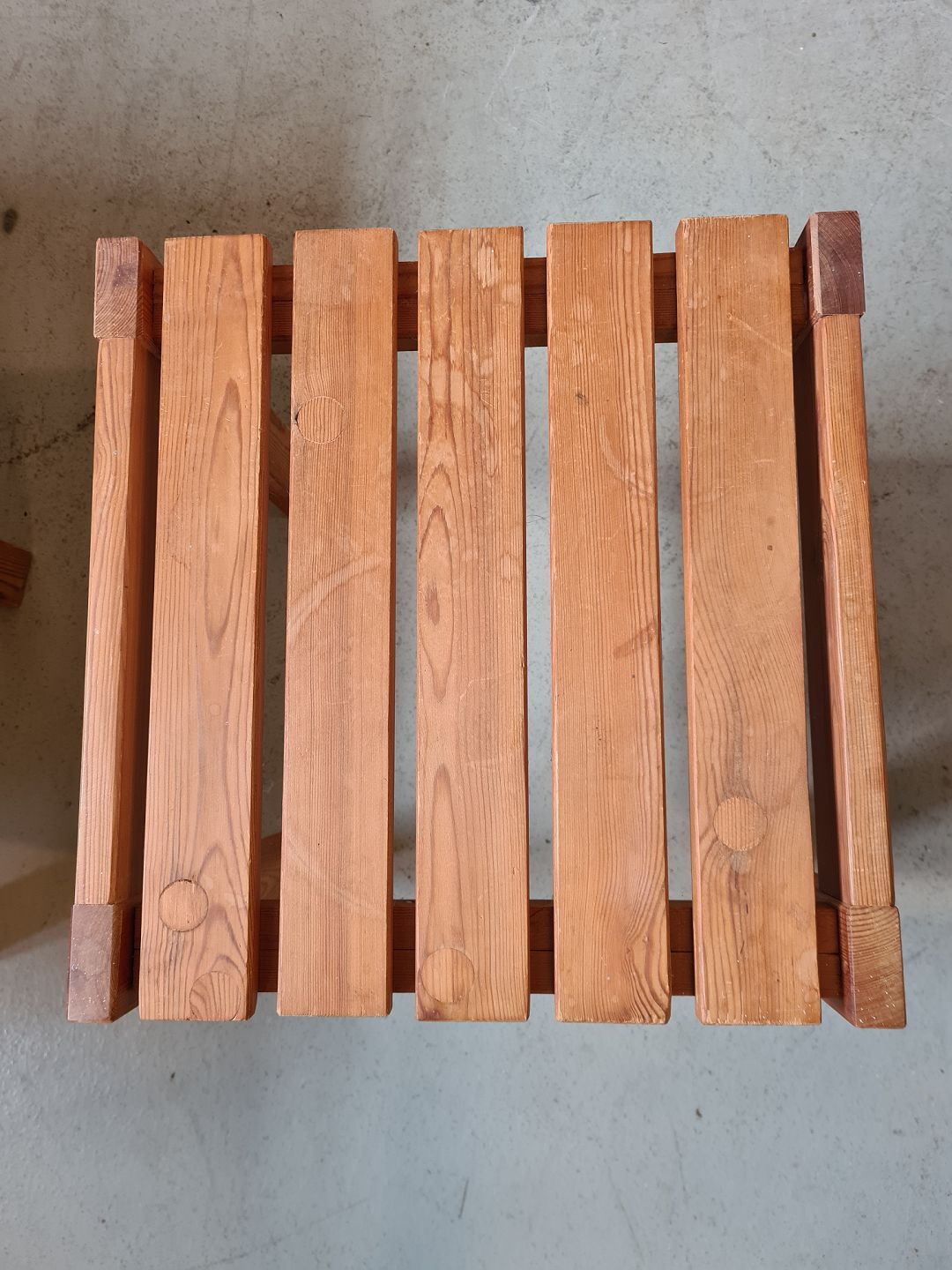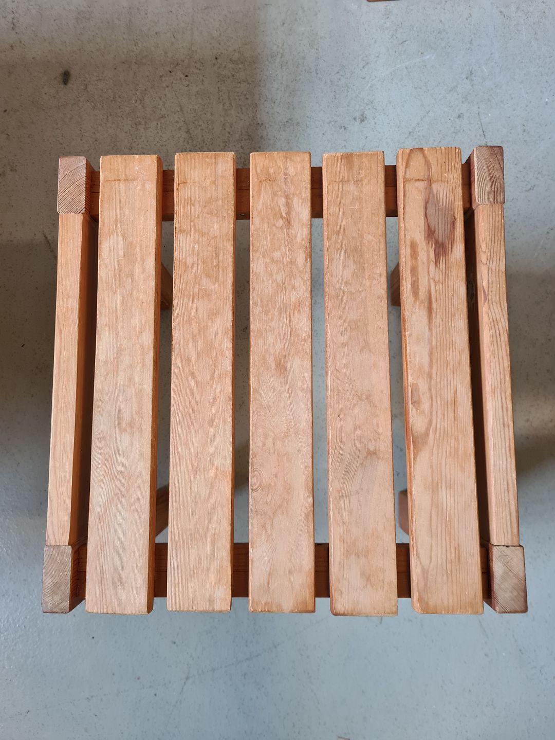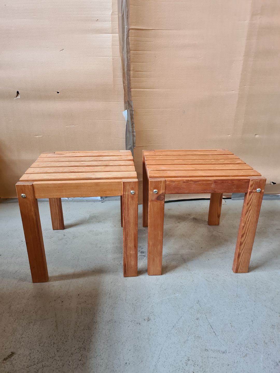 2 Taburetter i massivt fyrretræ, fra 1980erne. De har brugsspor. Højde 40cm Bredde 40cm Dybde 40cm Emne nummer: 73958