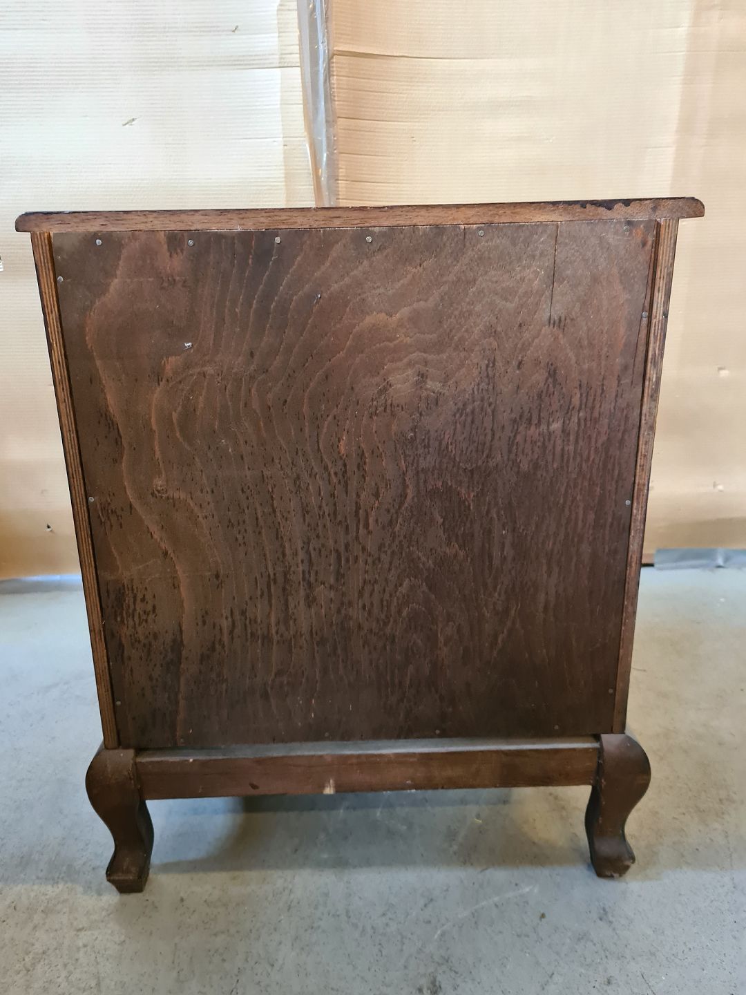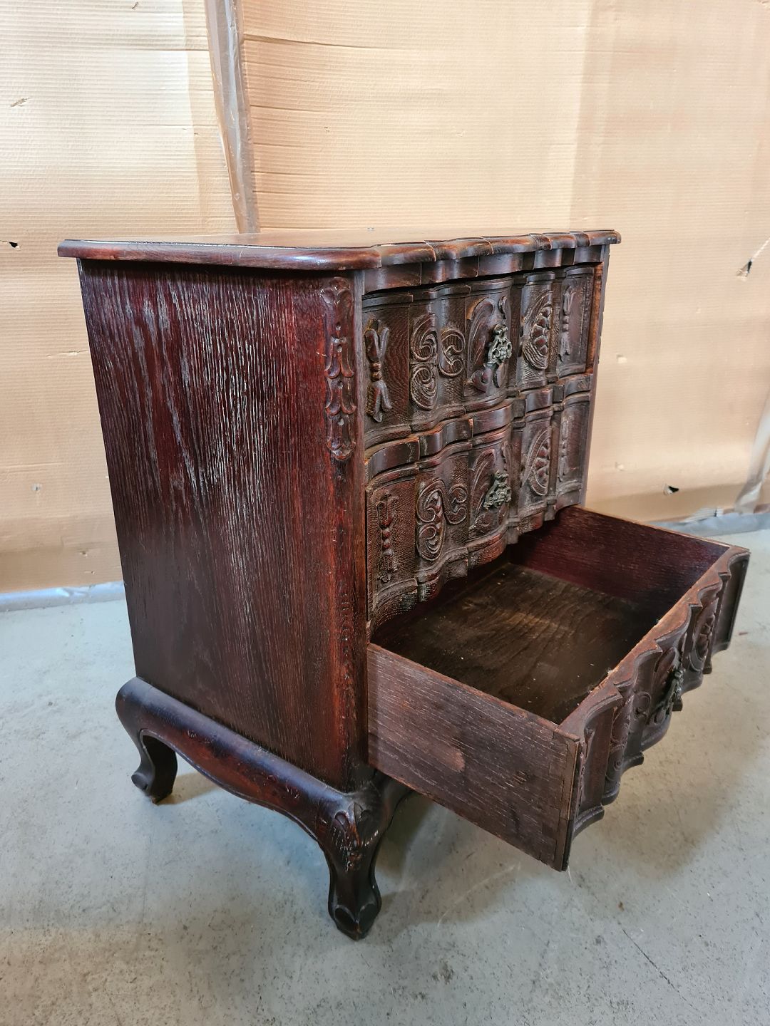 Kommode i massivt egetræ, fra 1940erne. Den har brugsspor og toppladen har en revne. Højde 66cm Bredde 54cm Dybde 34cm Emne nummer: 73960