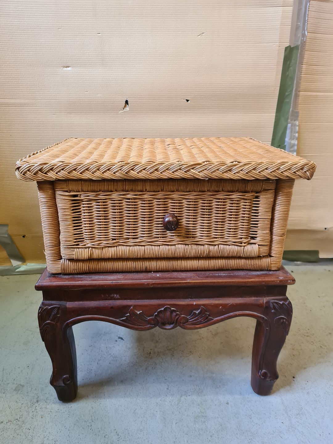 Natbord i massivt træ og kurveflet, fra 2000erne. Det har små brugsspor, men skuffen binder lidt. Højde 53cm Bredde 52cm Dybde 41cm Emne nummer: 74122