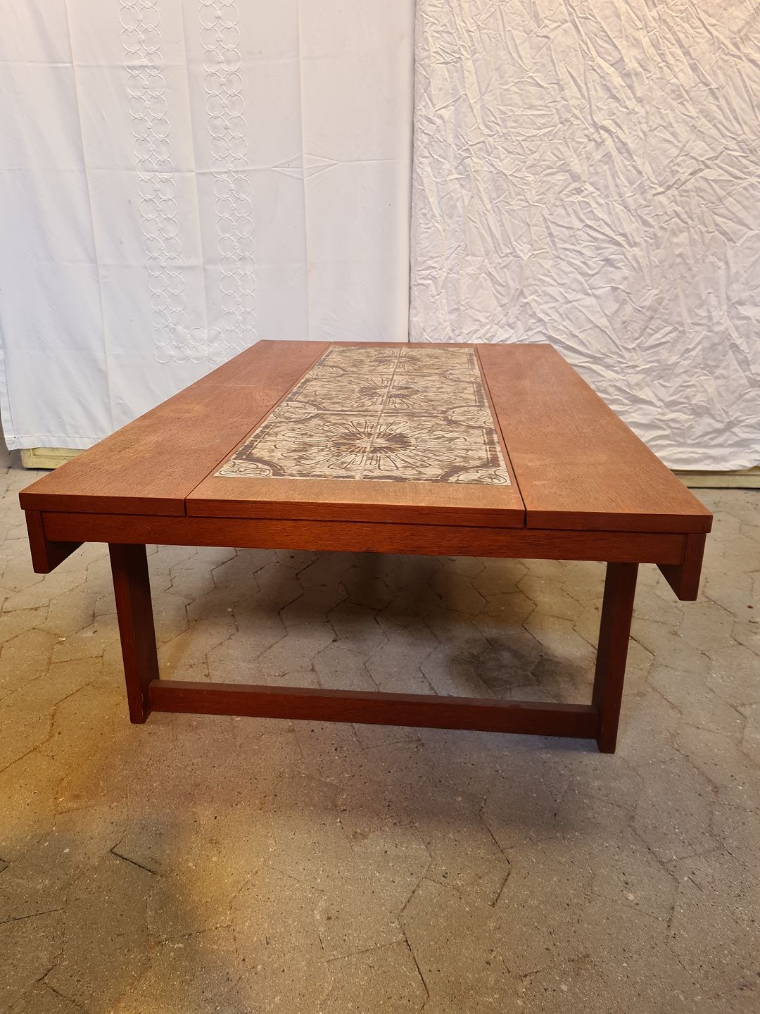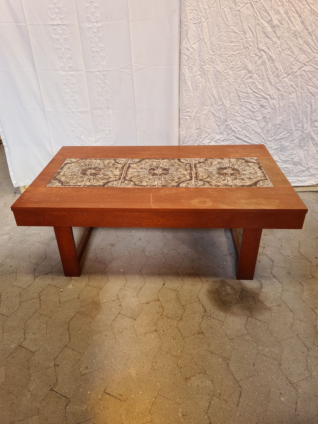 Sofabord i fineret og bejdset egetræ med kakler, fra 1970erne. Det har brugsspor. Højde 48cm Bredde 85cm Længde 140cm Emne nummer: 90534