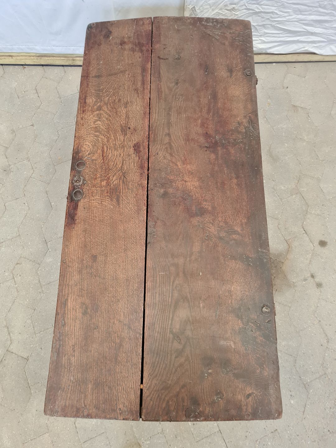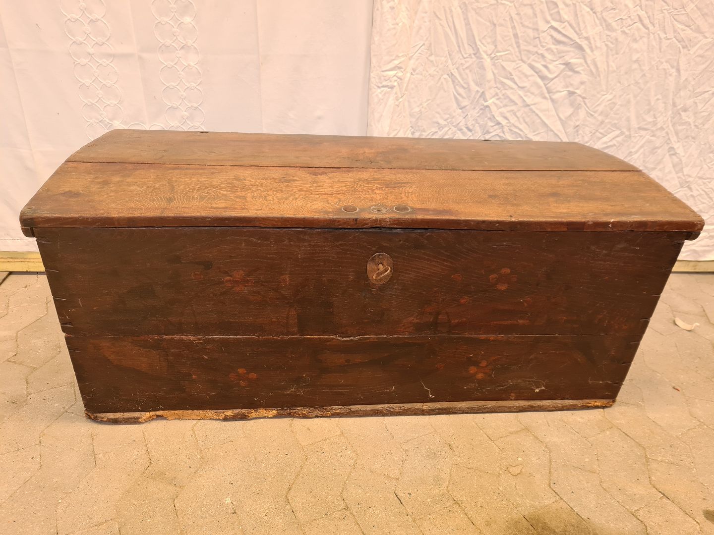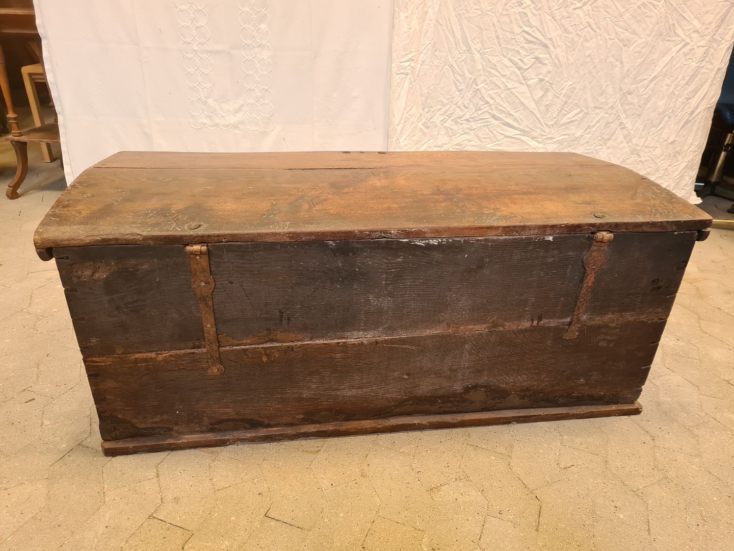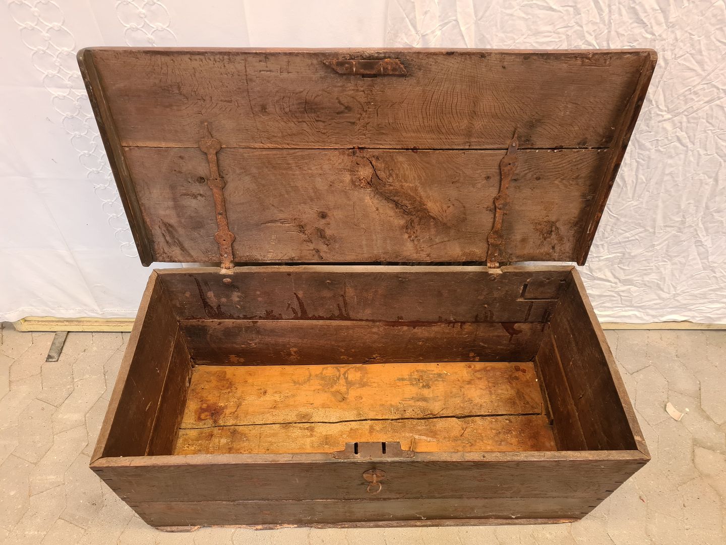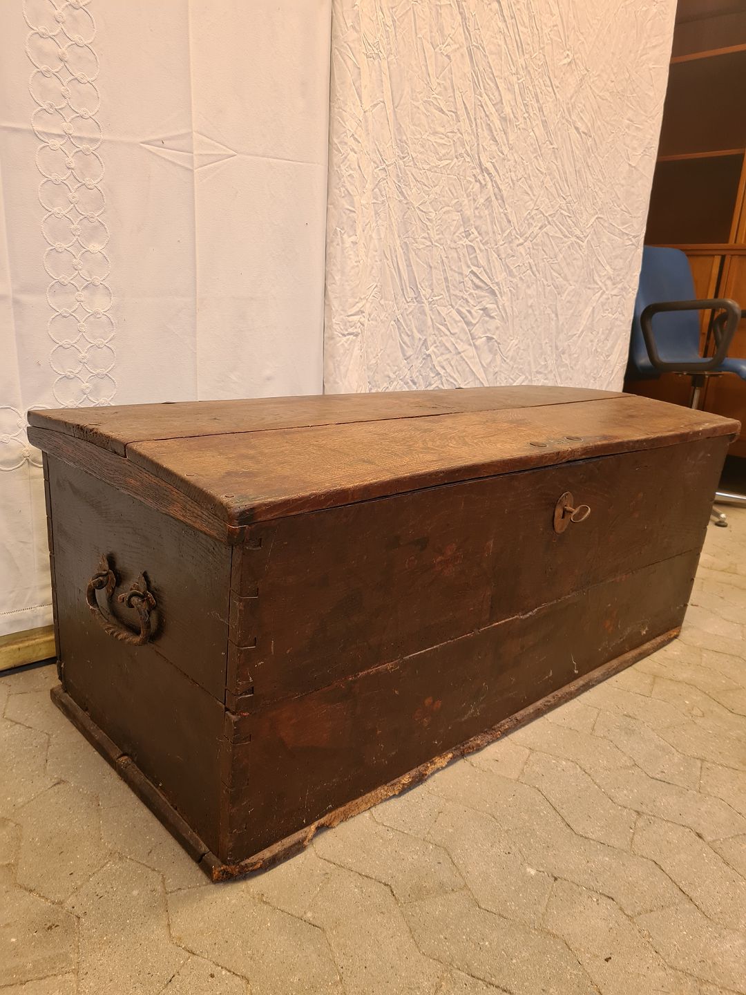 Kiste i massivt egetræ, fra 1870erne. Den har brugsspor, bunden er af fyrretræ og den har defekter. Højde 52cm Bredde 126cm Dybde 59cm Emne nummer: 90565