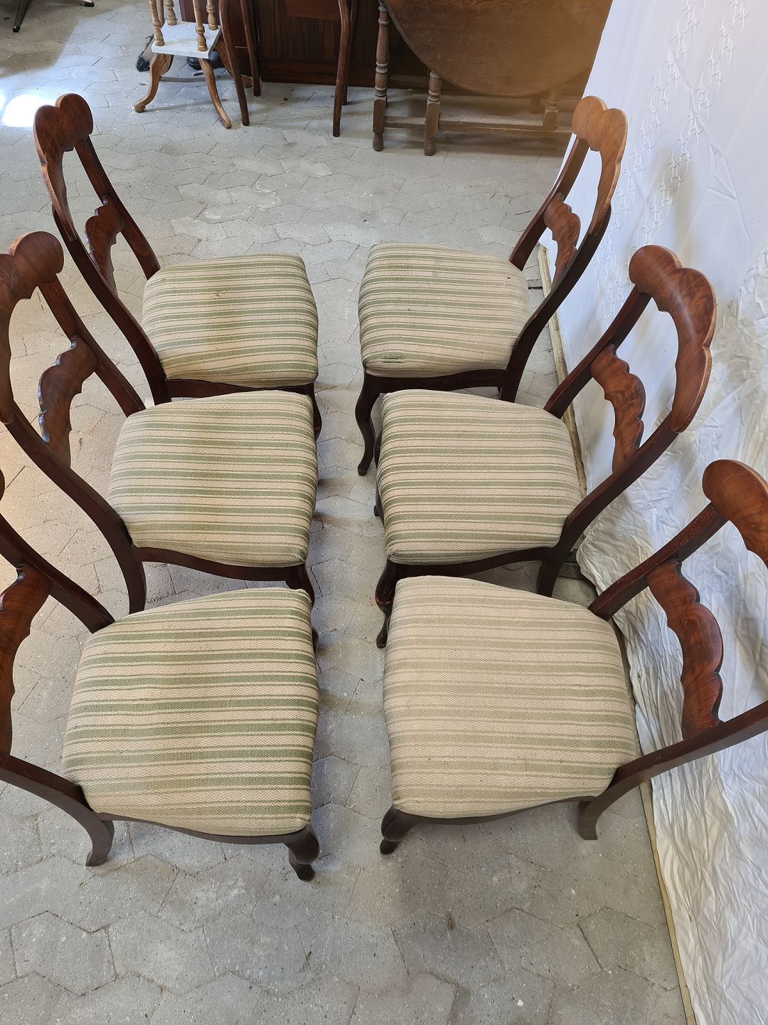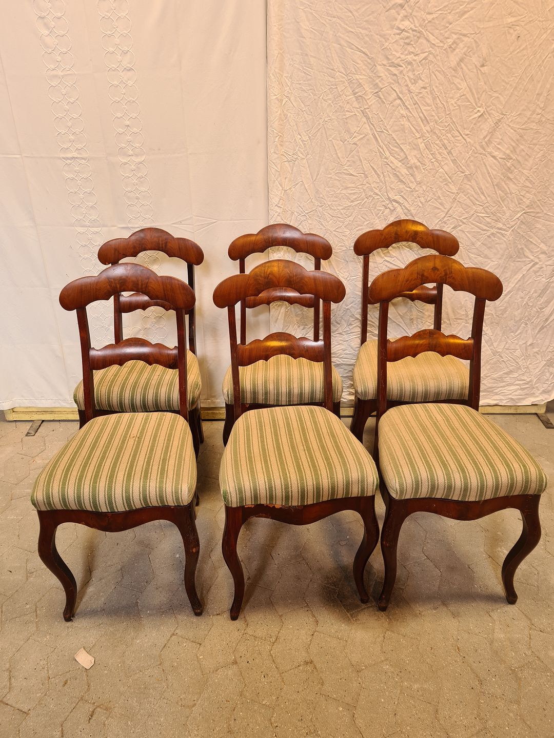6 Salonstole i massivt bøgetræ med fineret mahogni, fra 1900erne. De har brugsspor og finer defekter og de trænger til nyt betræk. Ryghøjde 97cm Sædehøjde 50cm Emne nummer: 90570