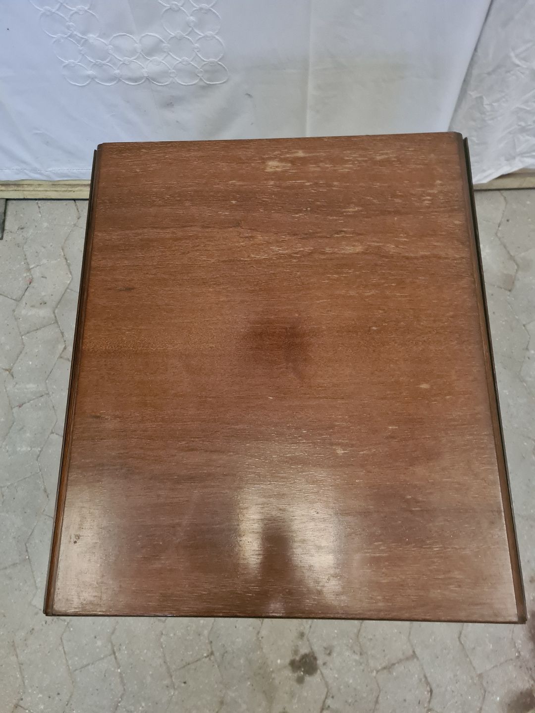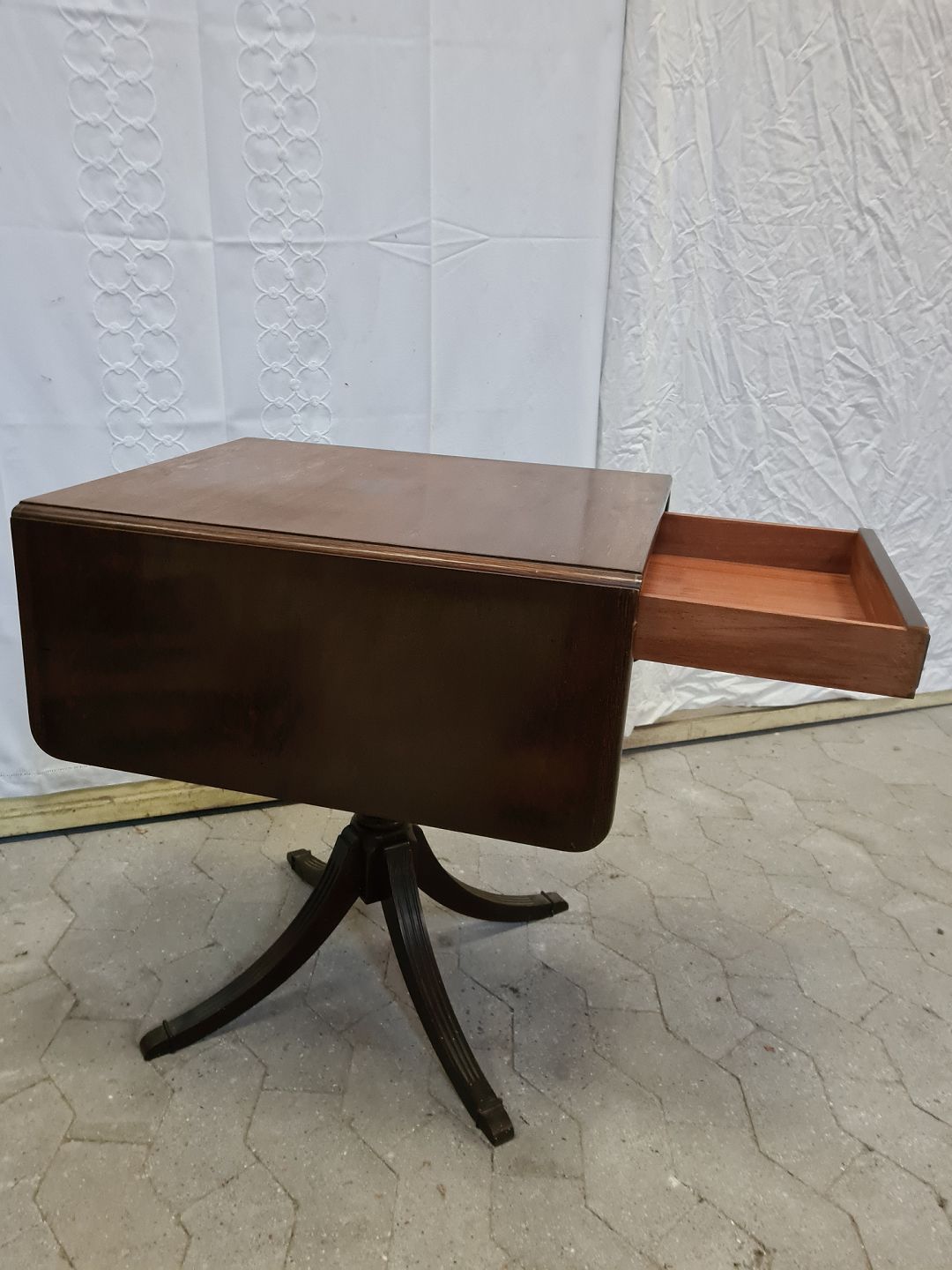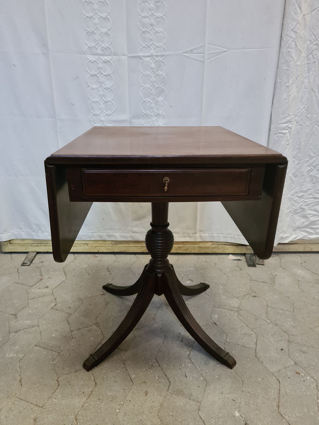 Lampebord i fineret mahogni, fra 1980erne. Det har brugsspor og den ene udtrækspind sidder fast. Højde 65cm Bredde 51cm Dybde 59cm Emne nummer: 90591