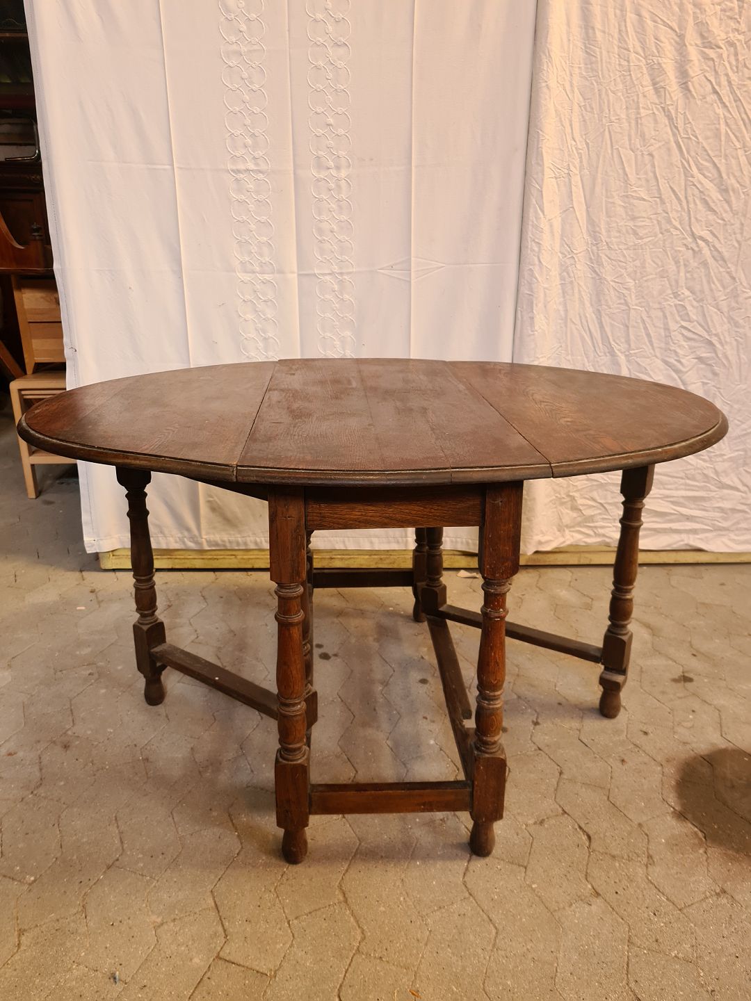 Bord i massivt egetræ, fra 1900erne. Det har brugsspor. Højde 73cm Bredde 106cm Længde 45cm Længde med klapper 136cm Emne nummer: 90600