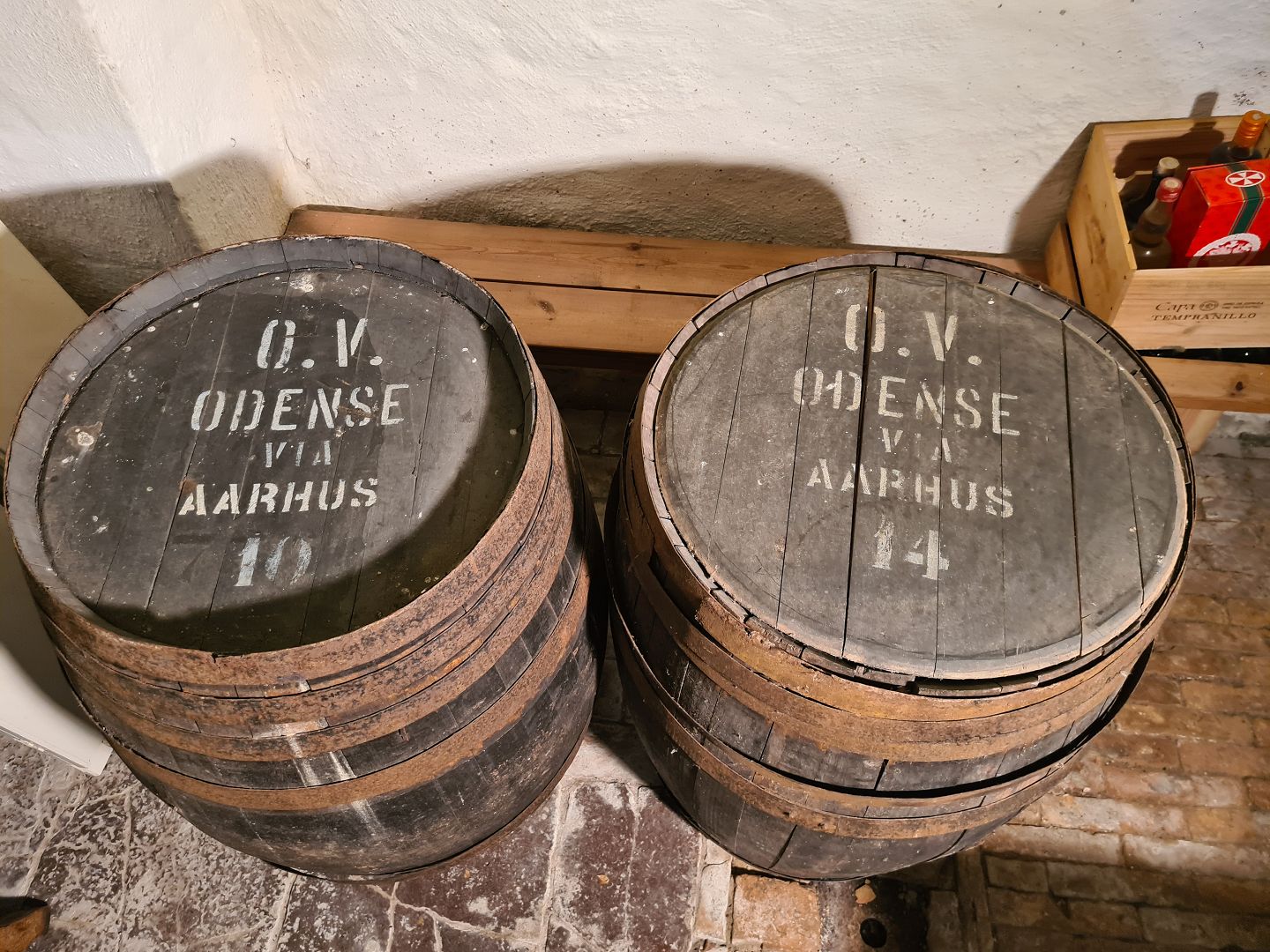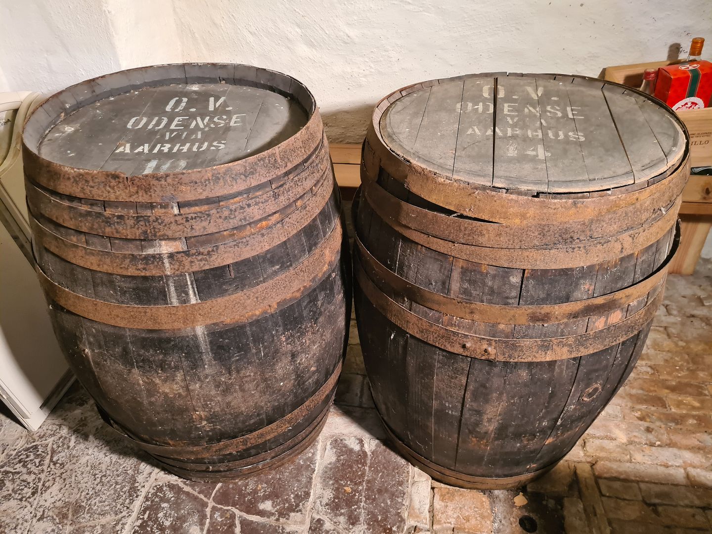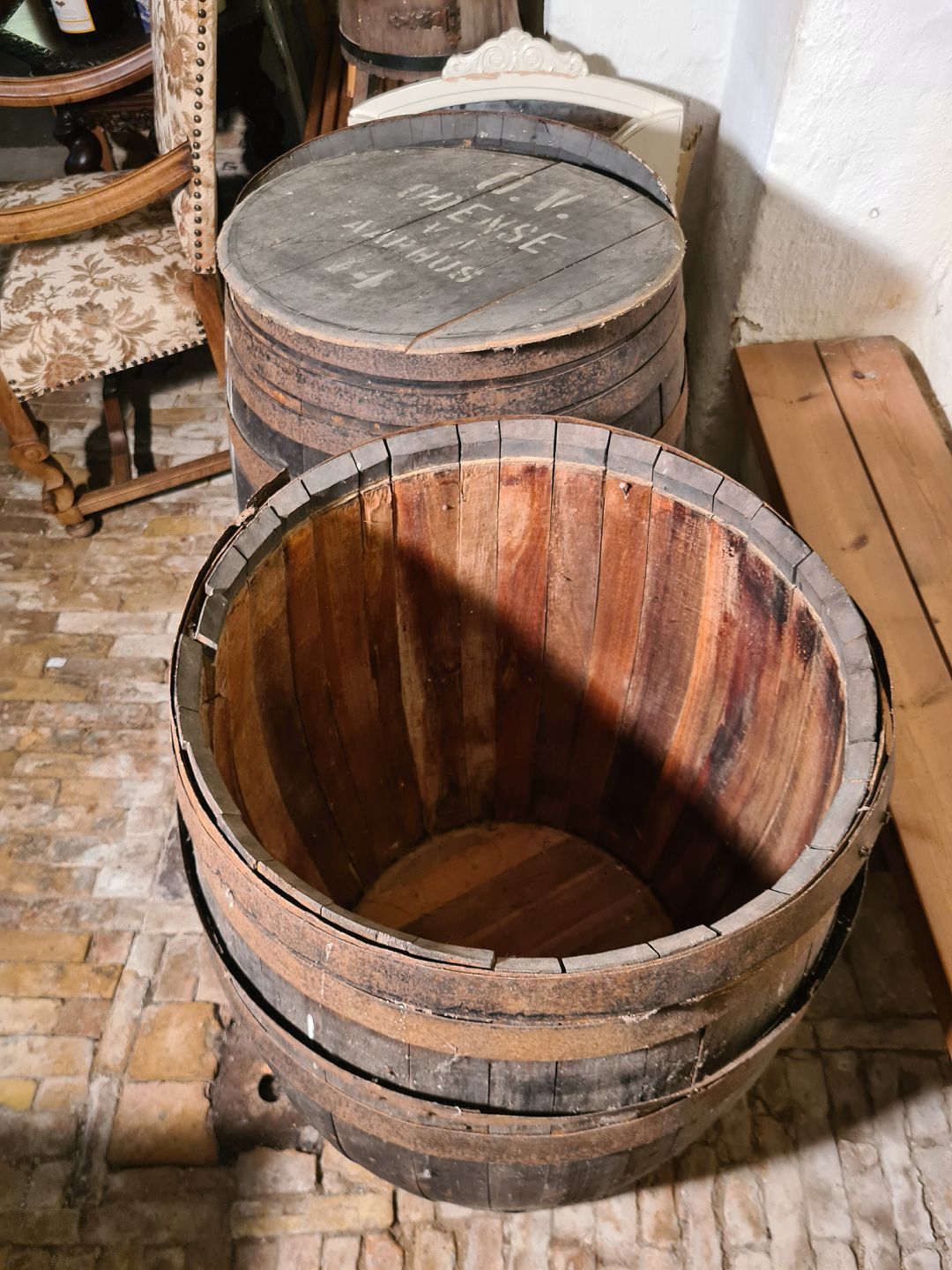 2 gamle Danske vintønder. Fremstår udmærket stabile dog med et par løse tøndebånd. Højde 95 cm. Diameter midt 70 cm. Emne nummer: 80287