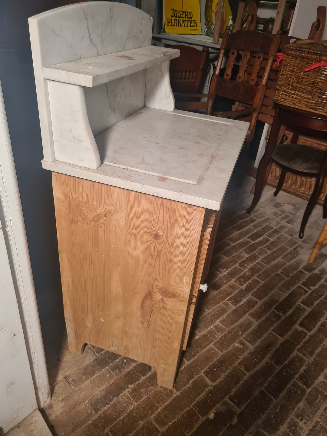 Servante i fyr med mamorplade og opsats. Fremstår pæn og velholdt uden nævneværdige brugsspor. HxBxD 101x63x42 cm. Emne nummer: 80295
