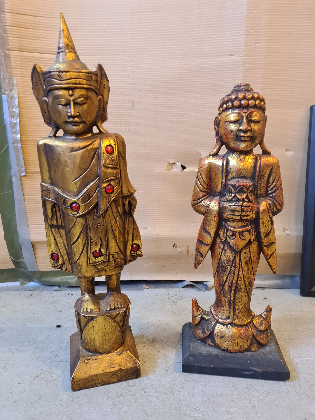 2 Guldmalet Budda figurer og 2 Billeder, fra 12980-1990erne. Figur højde 63cm Bileder : Højde 52cm Bredde 42cm og Højde 32cm Bredde 29cm Emne nummer: 74321