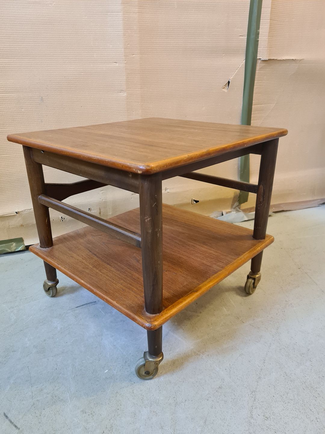 Lampebord i fineret teaktræ, fra 1960erne. Det har brugsspor og der mangler lister på den ene side. Højde 47cm Bredde 50cm Dybde 47cm Emne nummer: 74497