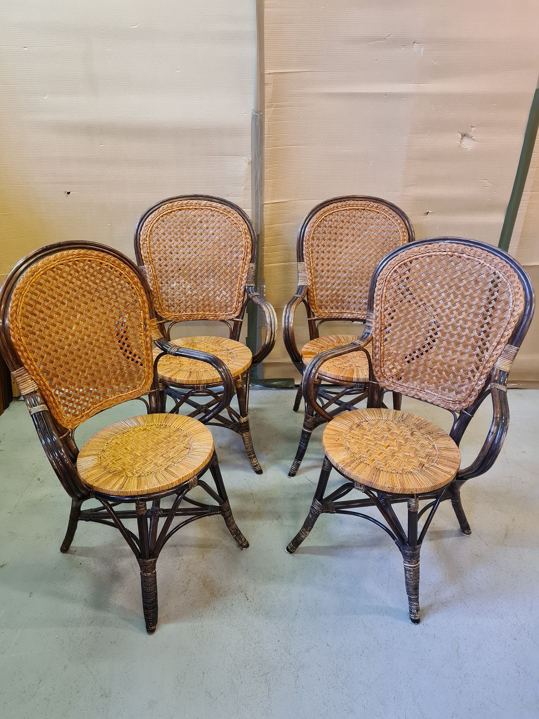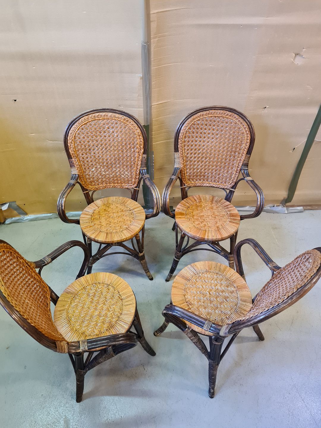 4 Armstole i kurveflet og bambus, fra 2000erne. De har brugsspor og hyndene er beskidte. Ryghøjde 100cm Sædehøjde 45cm Emne nummer: 74523