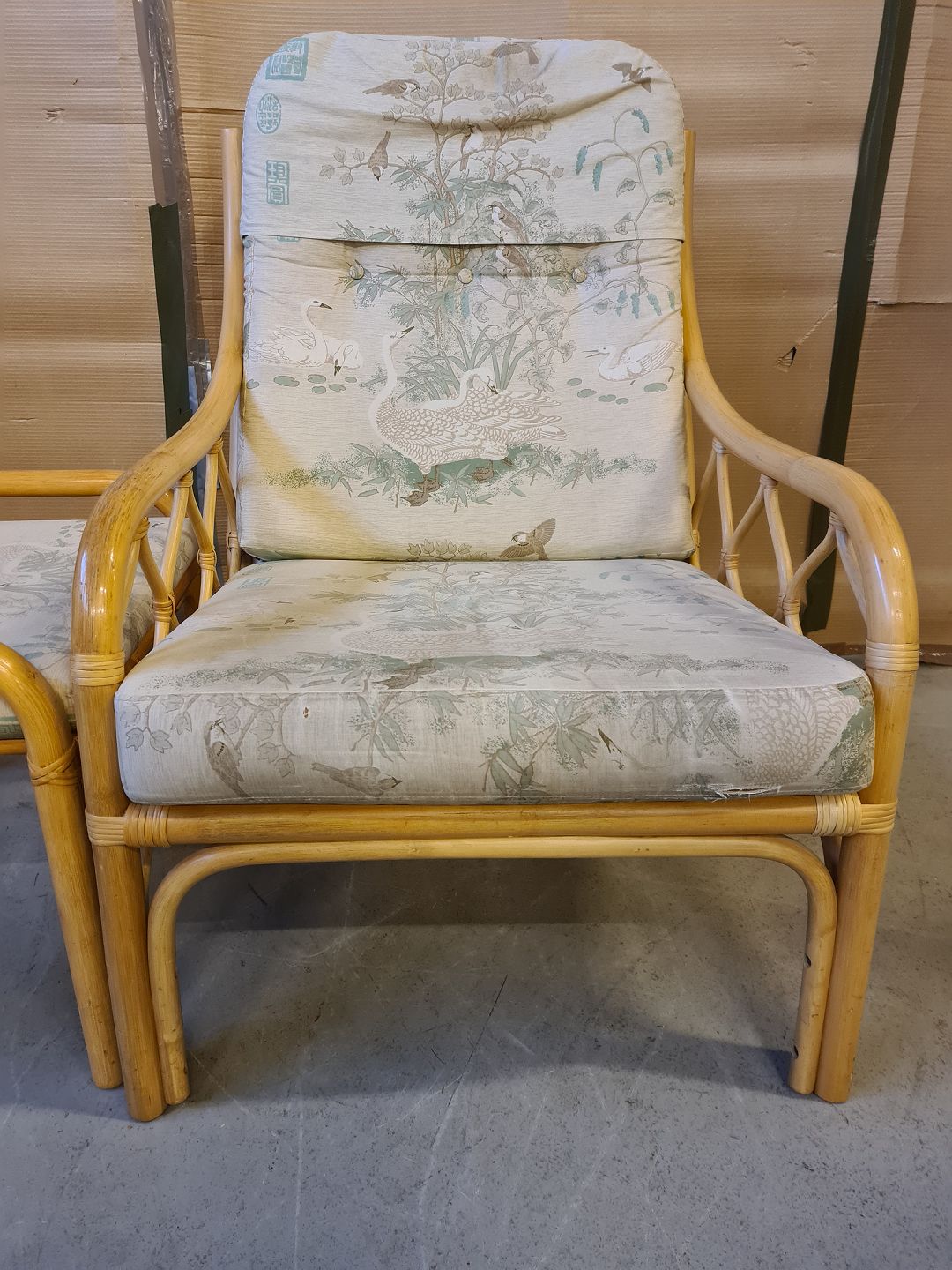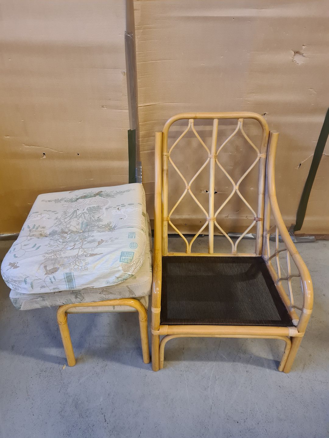 Bambus lænestol med fodskammel, fra 1990erne. Betrækket er slidt og defekt. Ryghøjde 97cm Sædehøjde 43cm Emne nummer: 74557