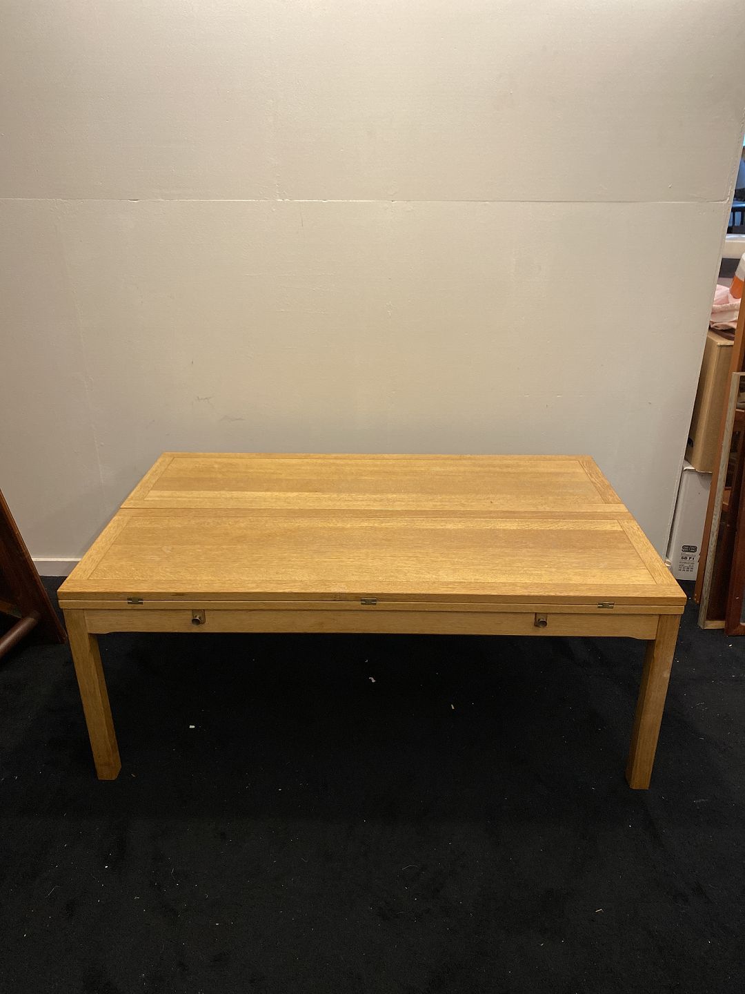 Sofabord i eg med klapper. Fremstår ok pænt og velholdt uden de store brugsspor. HxLxB 48x123x77 cm. Bredde udslået 154 cm. Emne nummer: 80311