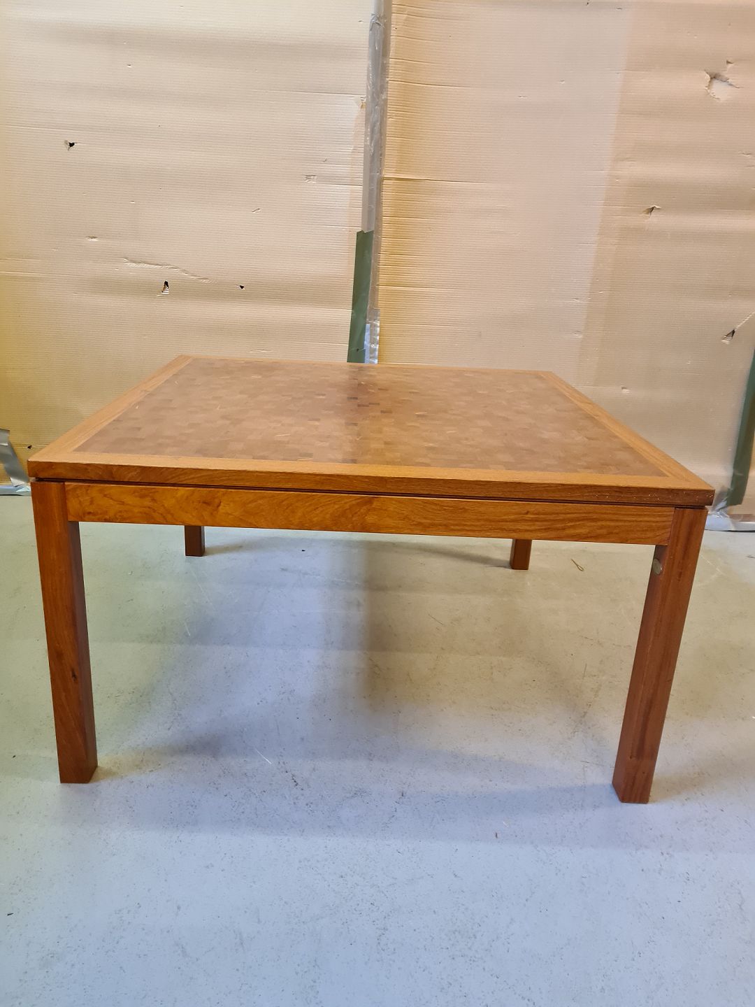 Mosaik sofabord i fineret teaktræ med massivt mosaik i flere træsorter, fra 1970erne. Det har små brugsspor. Højde 50cm Bredde 88cm Længde 88cm Emne nummer: 74663