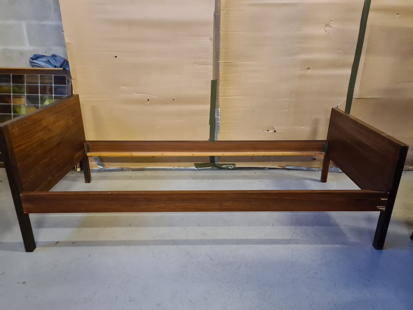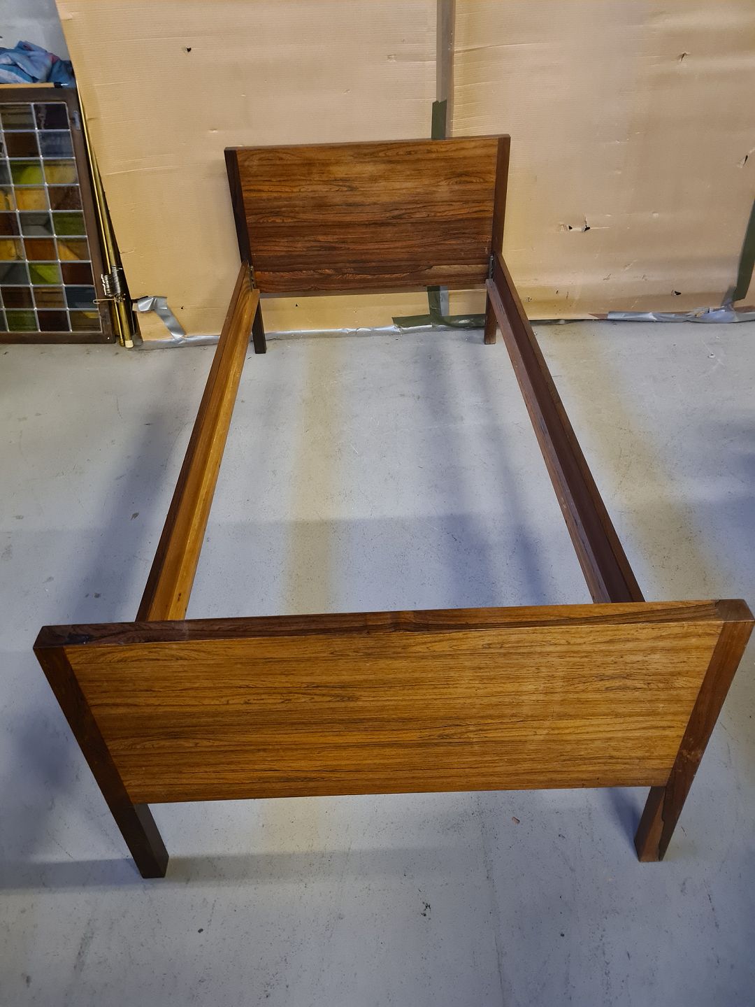 Seng i fineret palisander, fra 1960erne. Den har brugsspor og der medfølger ikke bund og madras. Hovedgærde højde 72cm Fodgærde højde 52cm Madras mål 85cm X 190cm Emne nummer: 74725