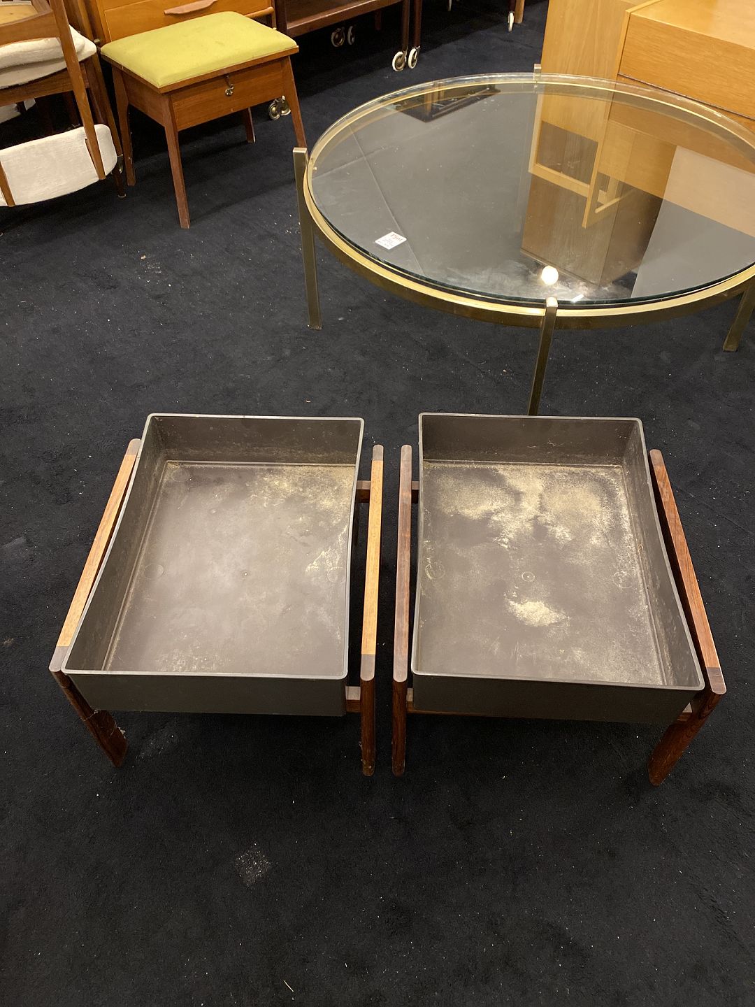 2 blomsterkummer i palisander med plastikkasse. Fremstår brugbare og udmærket stabile dog med lidt brugsspor i nede i kasserne. HxLxB 32x50x36 cm. Emne nummer: 80351