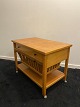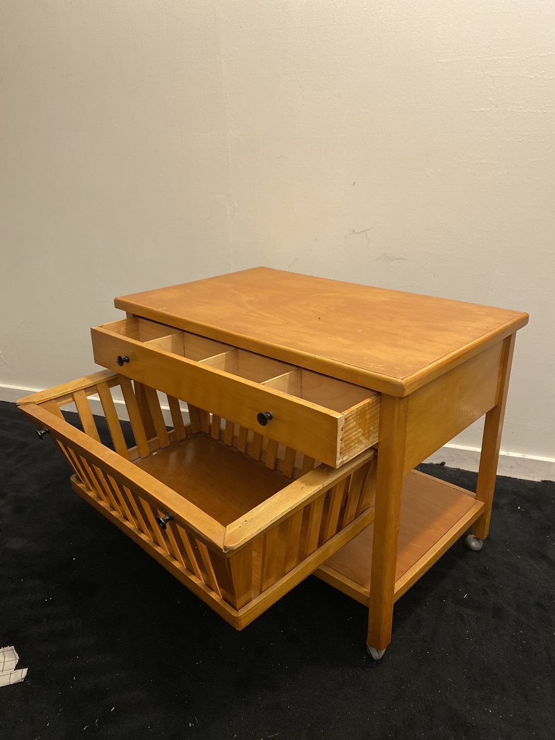 Sybord i eg på hjul og med skuffe og kurv. Fremstår pænt, velholdt og udmærket funktionelt uden nævneværdige brugsspor. HxBxD 53x67x43 cm. Emne nummer: 80368