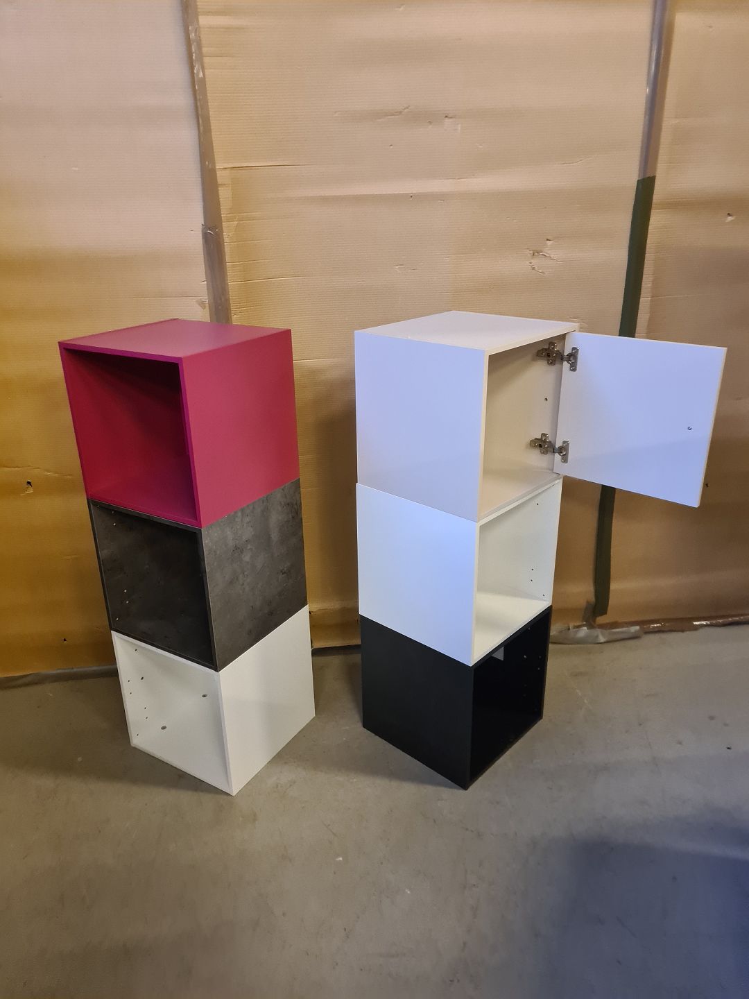 6 Vægreol kasser i laminat, af nyere dato. De har små brugsspor. Højde 36cm Bredde 36cm Dybde 34,5cm Emne nummer: 74774
