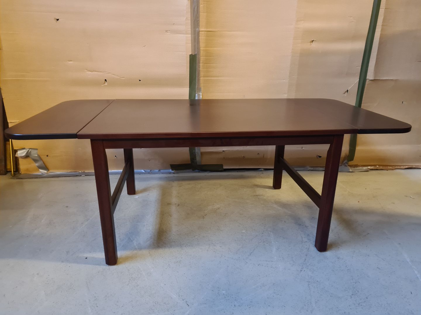 Sofabord i fineret mahogni, af nyere dato. Det har brugsspor. Højde 57cm Bredde 74cm Længde 100cm Længde med klapper 150cm Emne nummer: 74806