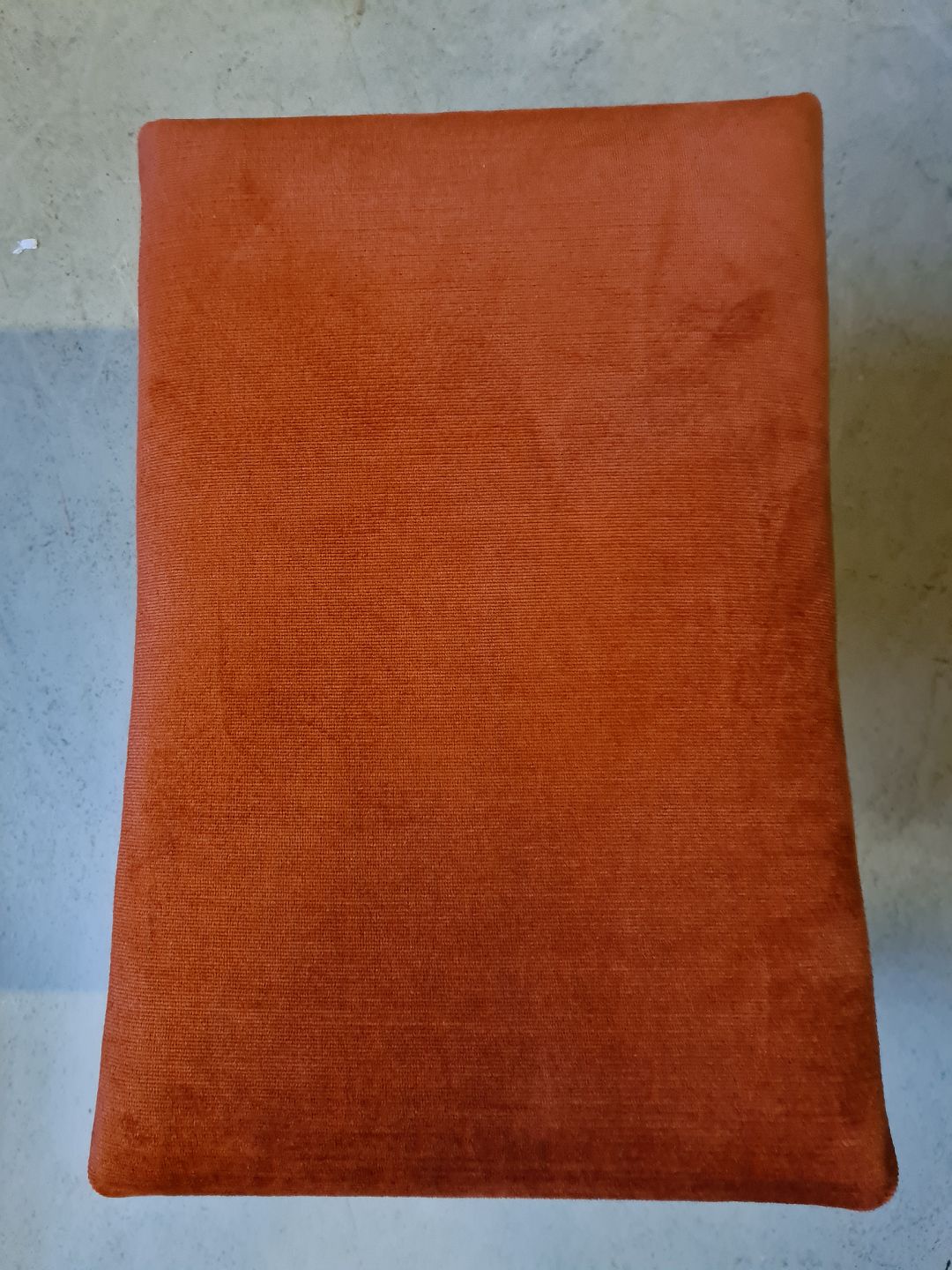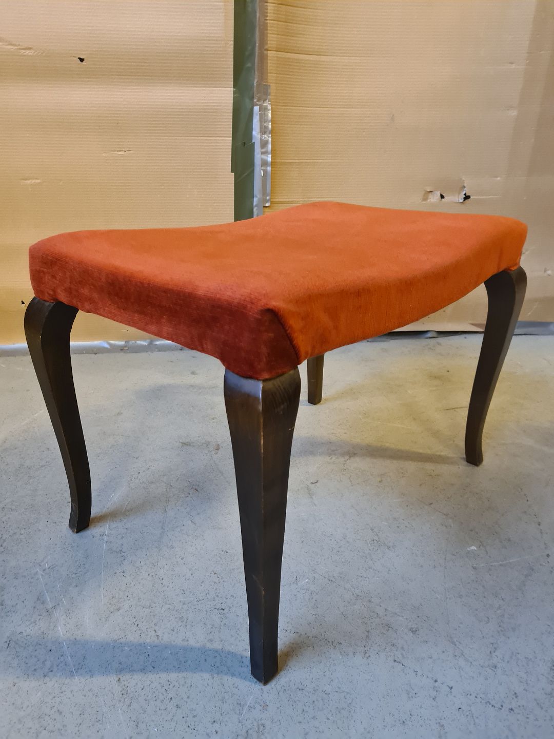 Skammel i egetræ med velourbetræk, fra 1940erne. Den har brugsspor. Højde 39cm Bredde 37cm Længde 55cm Emne nummer: 74808