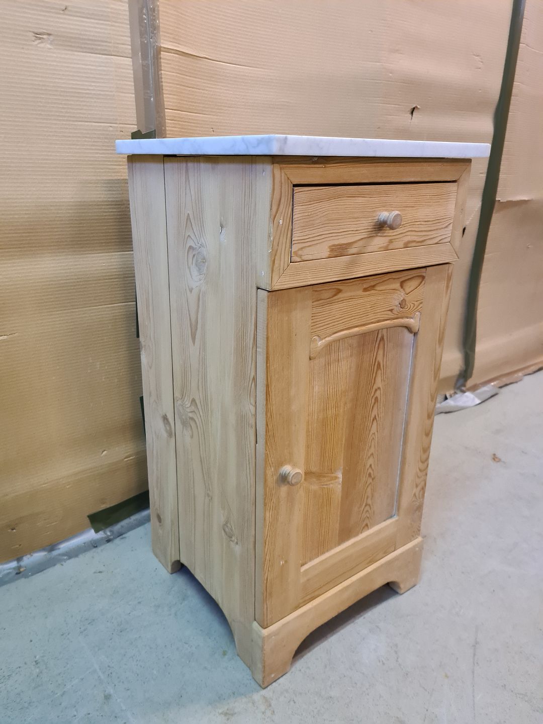 Natskab i massivt fyrretræ med marmorplade, fra 1920erne. Det har brugsspor og revner på siderne. Højde 77cm Bredde 39cm Dybde 39cm Emne nummer: 74841