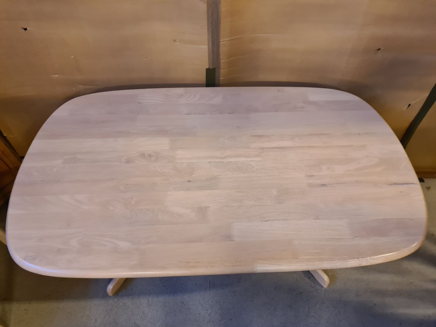 Bord med 6 stole i massivt træ, af nyere dato. De har små brugsspor. Stole mål : Ryghøjde 101cm Sædehøjde 46cm Bord mål : Højde 74cm Bredde 90cm Længde 150cm Emne nummer: 74942