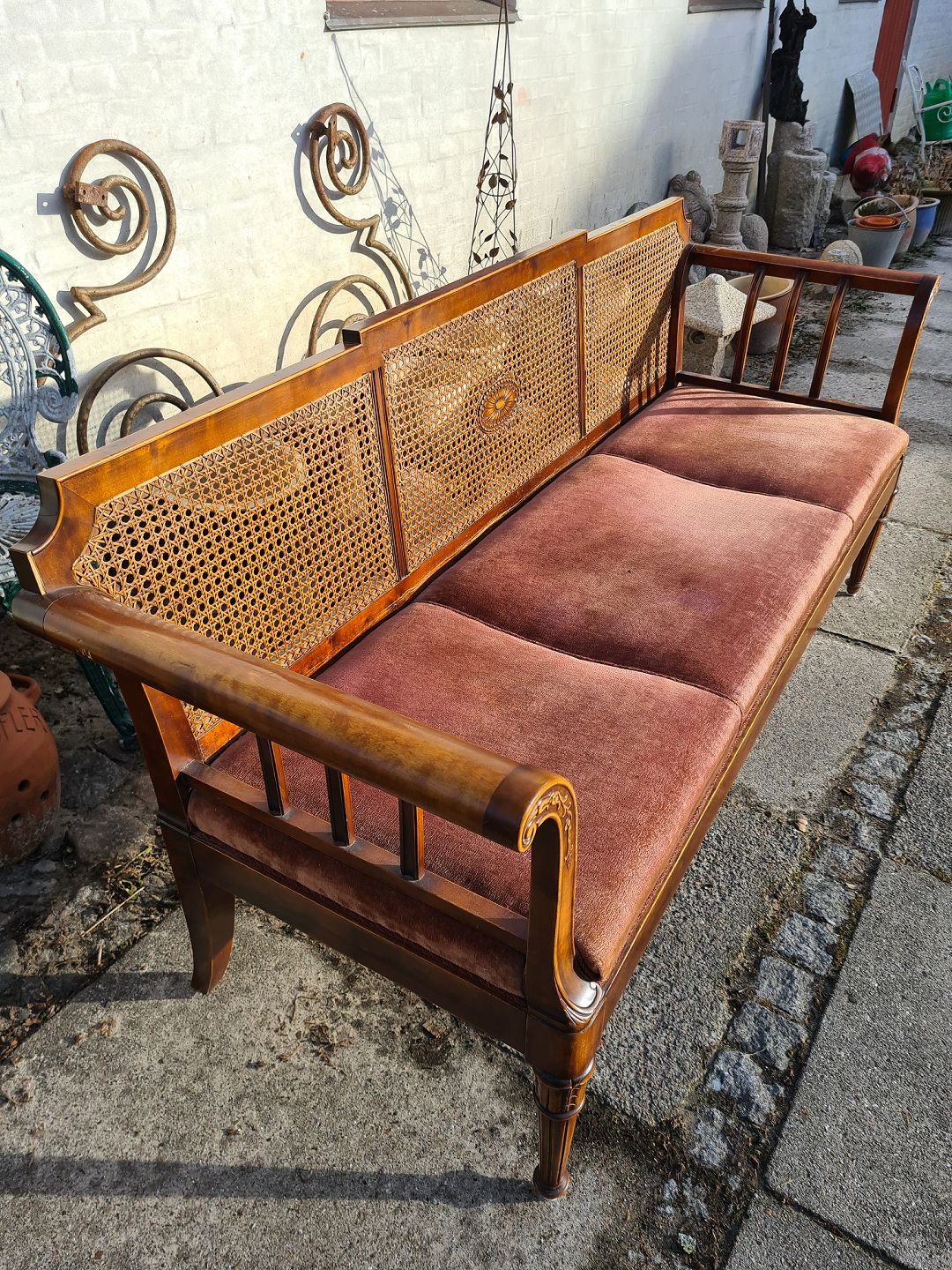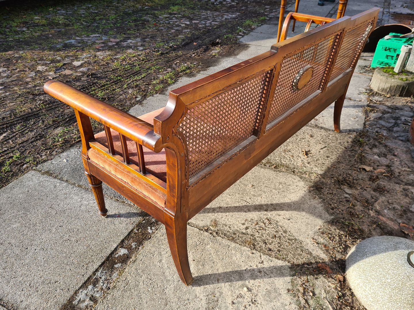 3 pers. bænk i birk med ryg i rørflet, udskæringer på armlæn og med velourbetrukket sæde. Svensk produceret i 1930'erne. Fremstår pæn, velholdt og udmærket stabil. Dog med brugsspor på sæde og manglende liste på ryg i venstre side. (Billede)