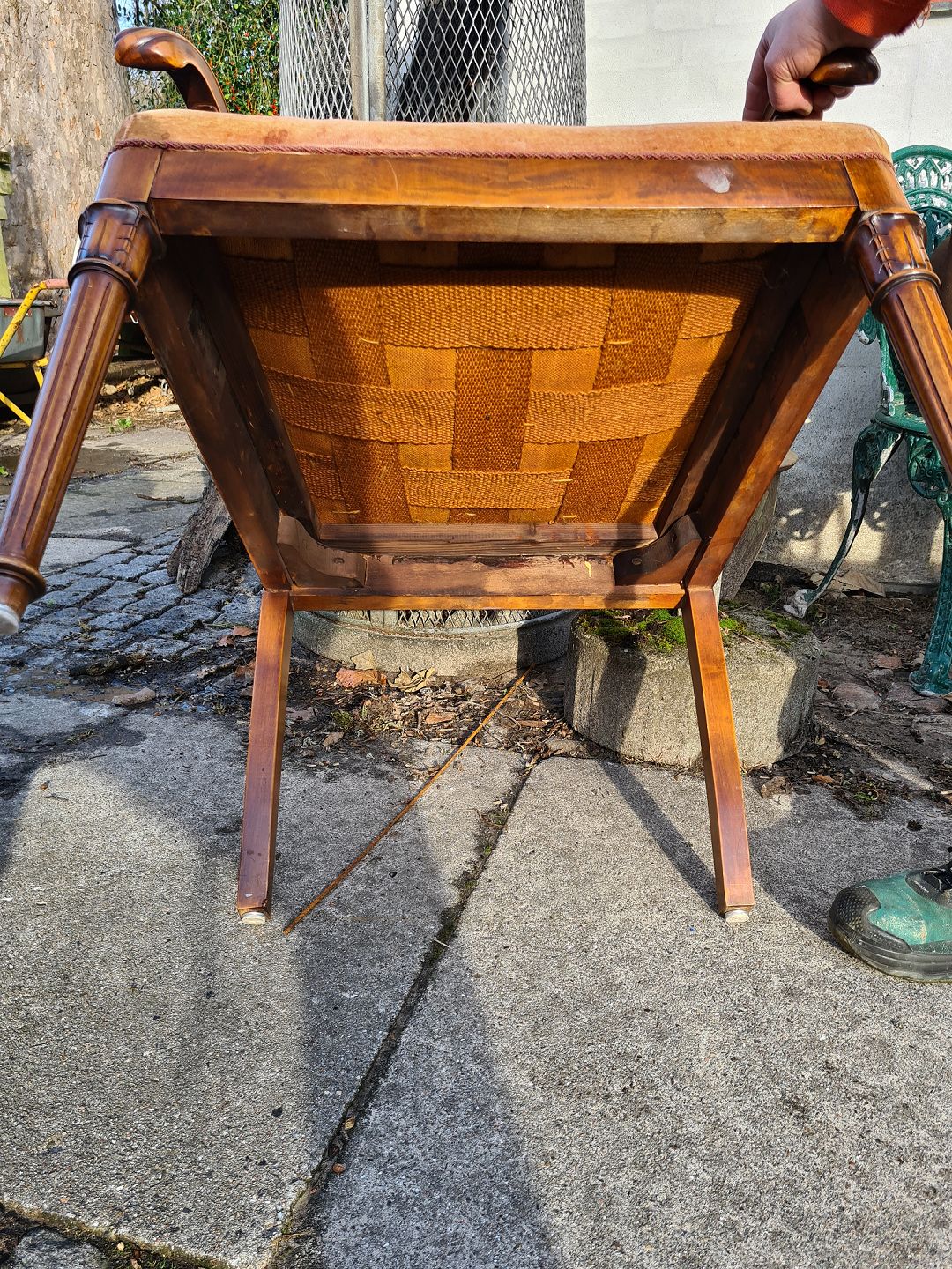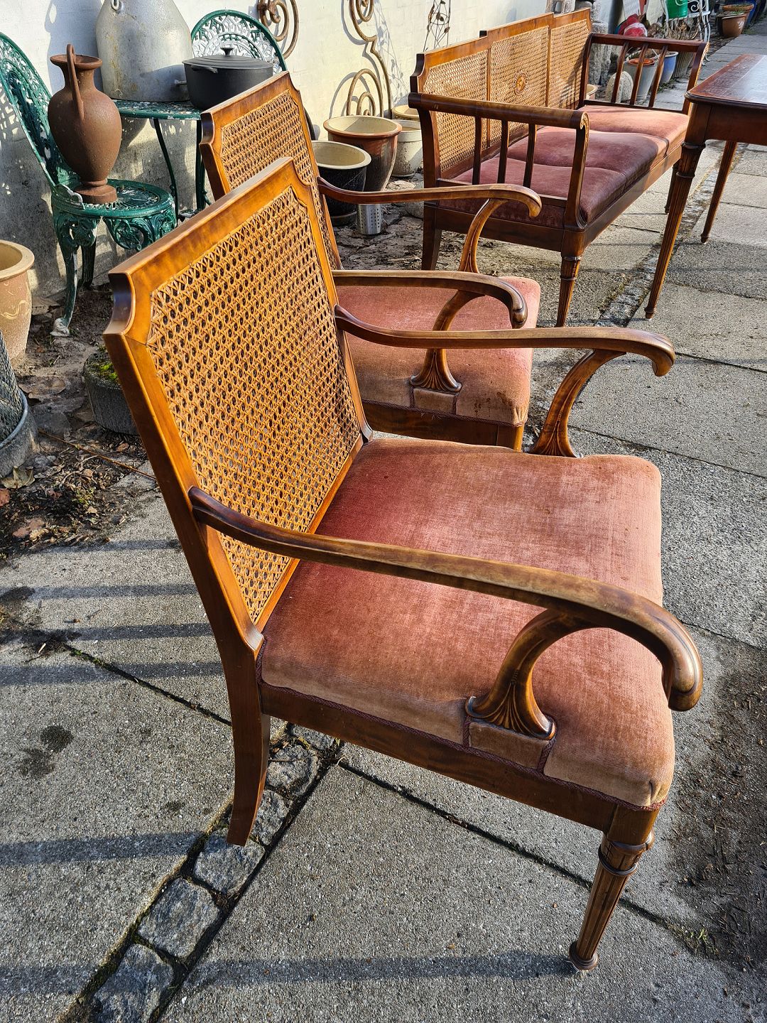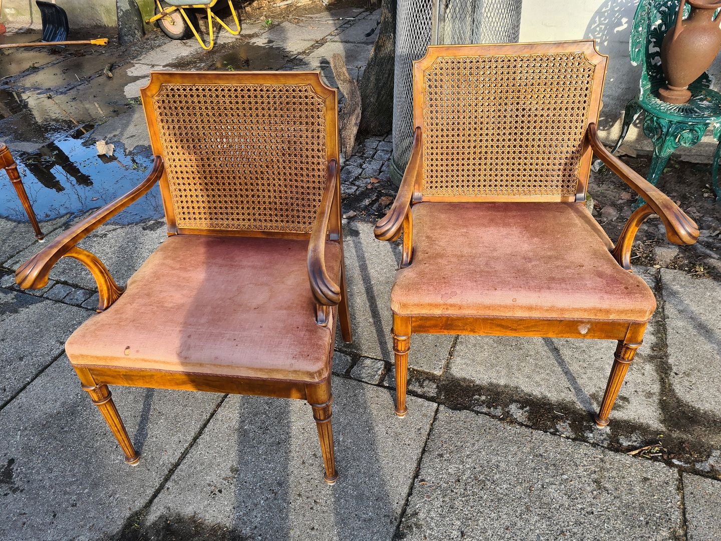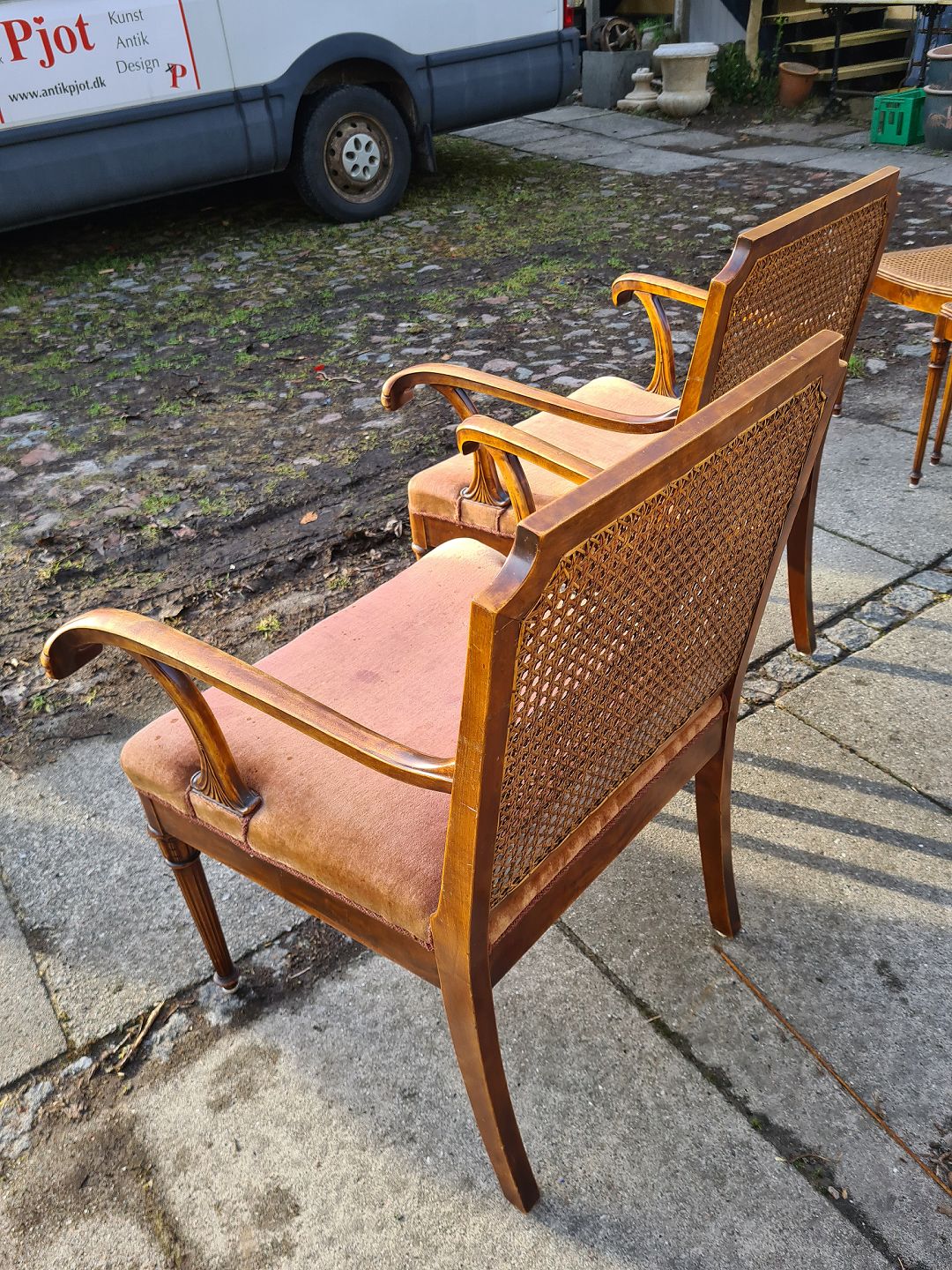 2 Armstole i birk med ryg I rørflet og velourbetrukket sæde. Svensk produceret i 1930'erne. Fremstår pæne, velholdte og udmærket stabile. Dog med brugsspor på sæderne.